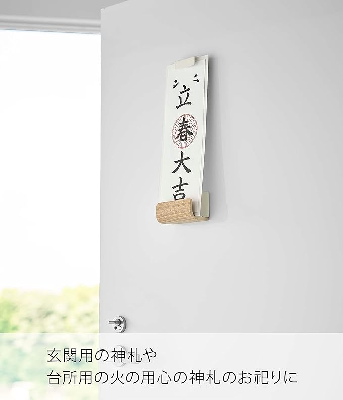Easily attach to a steel front door or the side of a refrigerator with a magnet. A beautiful wooden talisman holder. You can worship talismans even in homes without a Shinto altar. It is also recommended for worshiping talismans for the front door or fire prevention talismans in the kitchen. The spacing between the upper and lower parts can be adjusted according to the length of the talisman. You can worship the talisman by lifting it off the wall, so the refrigerator or front door will not get dirty. This is a single type that can worship one talisman. Source: https://www.amazon.co.jp/
