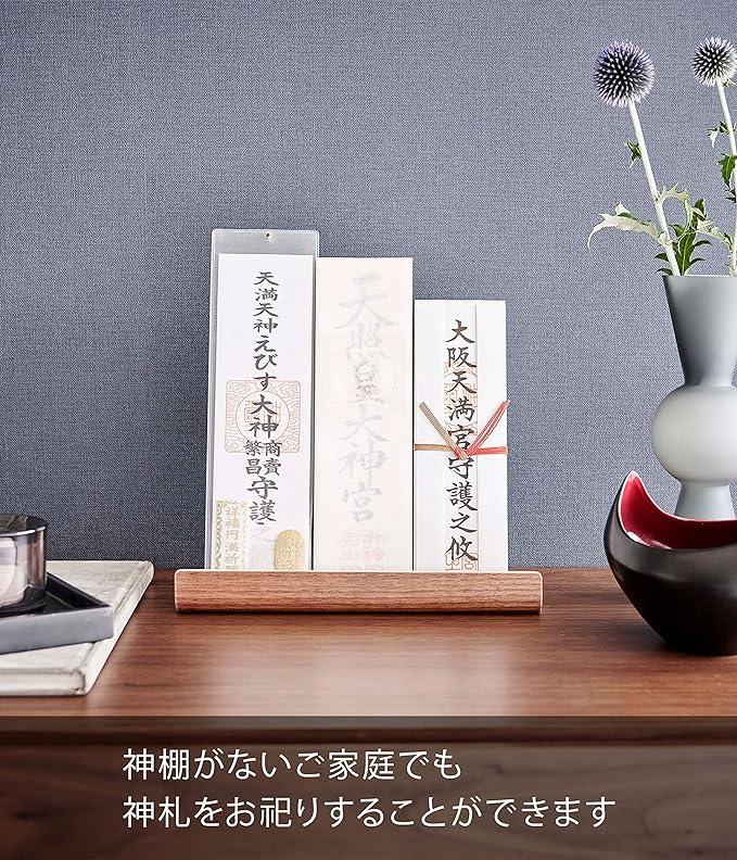 Enshrine your precious kamifuda (sacred talismans) on this dedicated stand. This kamifuda stand is perfect for enshrining kamifuda (sacred talismans) received from shrines. Homes without a kamidana (shrine altar) can often struggle to find a place to store them, but this kamifuda stand solves that problem. Burn your current kamifuda at the end of the year to express your gratitude, and enshrine a new kamifuda as the new year approaches. Choose from two color variations to suit your taste: a sophisticated brown paired with a chic wood grain, or a soft natural finish. The RIN series' unique wood grain design complements both Japanese and Western-style rooms, making it versatile. We also recommend choosing a wood grain color to match the color of your furniture. Enshrine multiple kamifuda (sacred talismans) in the same place. Standing kamifuda (sacred talismans) prevents them from falling over. With a width of 25cm, you can enshrine up to three standard kamifuda (sacred talismans) at once. Conveniently enshrine kamifuda (sacred talismans) received from multiple shrines in one place. No drilling required, making it suitable for rented properties. This stand is ready to use, simply place it on a chest in the living room or wherever the family gathers. Since it doesn't require wall mounting, it's perfect for rented homes where drilling holes in the wall isn't an option. Also available: a single type for enshrining a single Shinto amulet. The RIN series Shinto amulet stand is also available in a single size, suitable for a single Shinto amulet. Different sizes can be installed to suit each location. *This page is for the Shinto amulet stand; please see the separate page for the single type. Source: https://kurasso.woman.mynavi.jp/