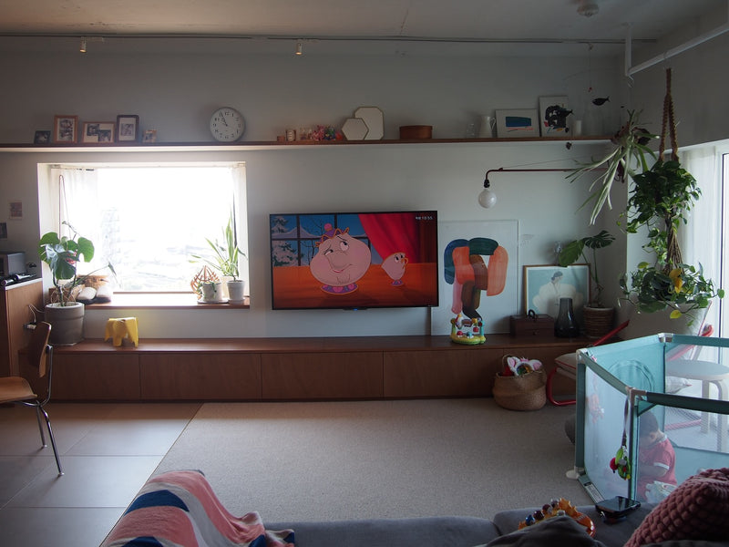 テレビボードも兼ねてるので、壁付テレビの背面から収納内に配線も送れるようにしています📺