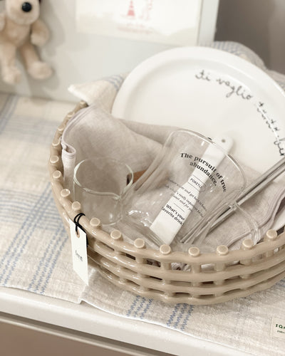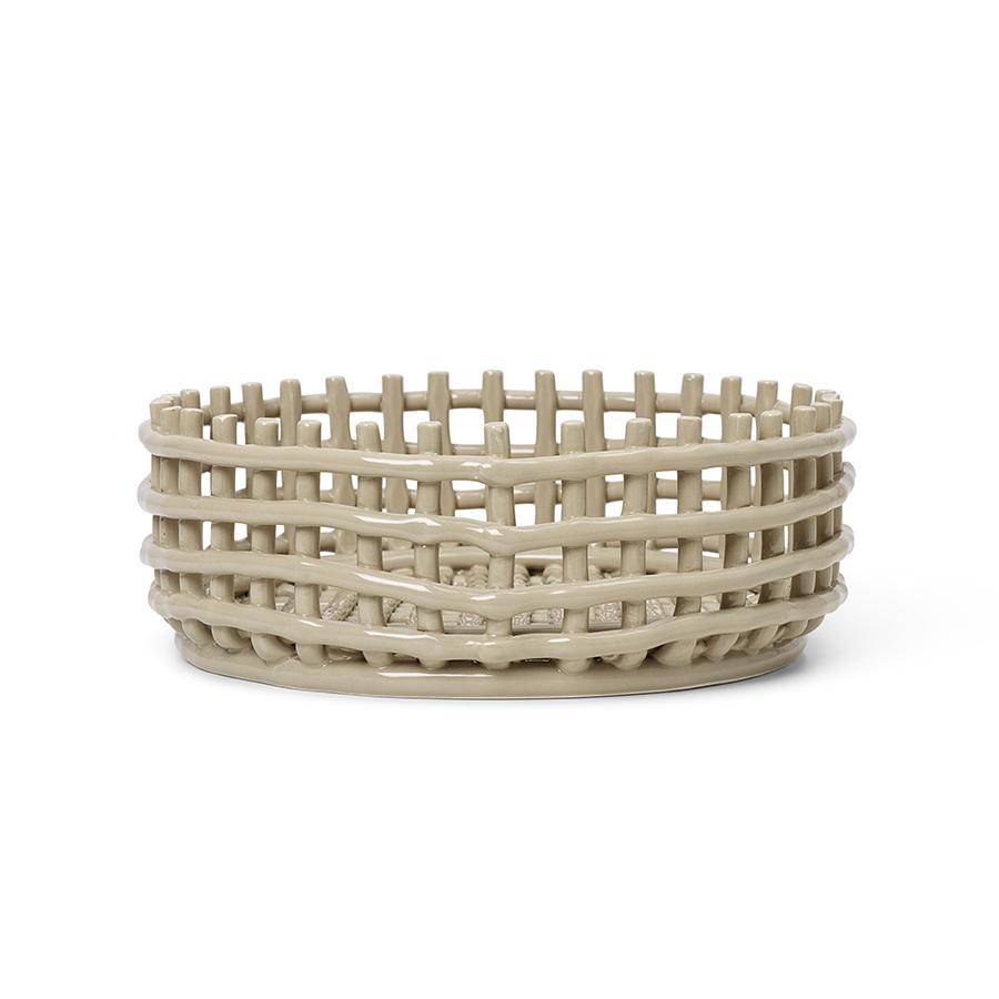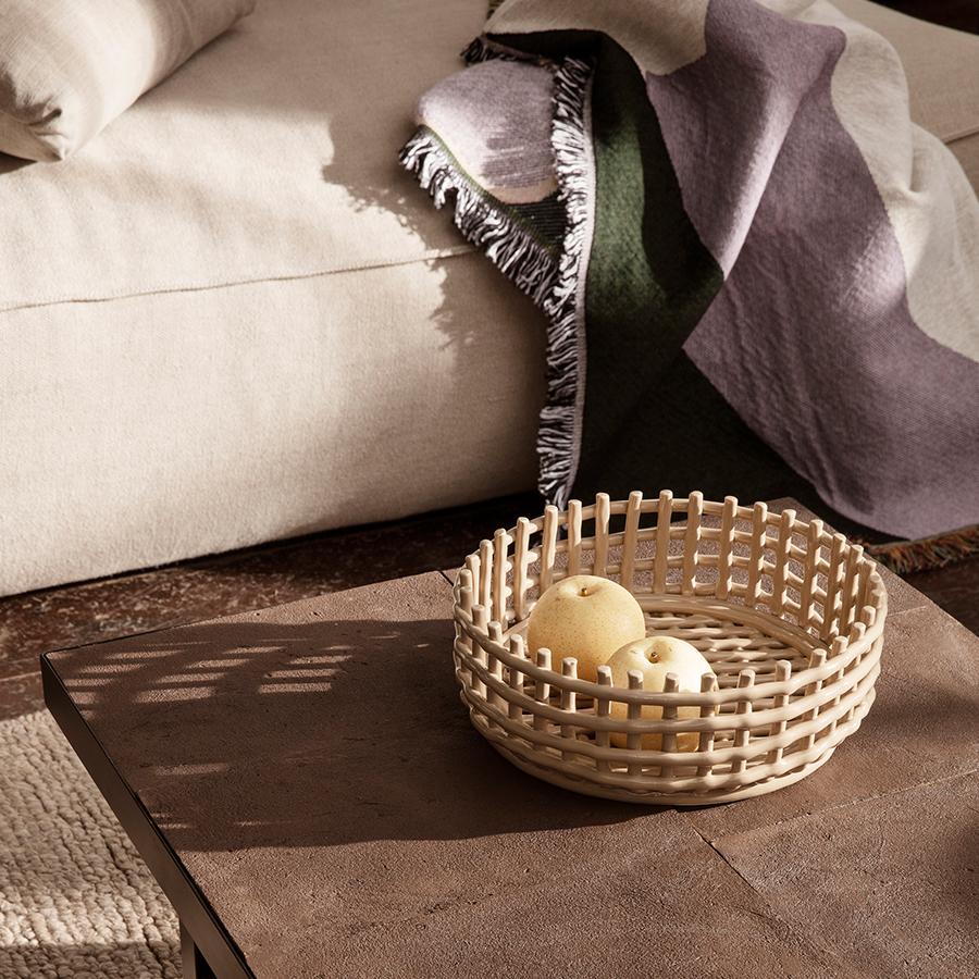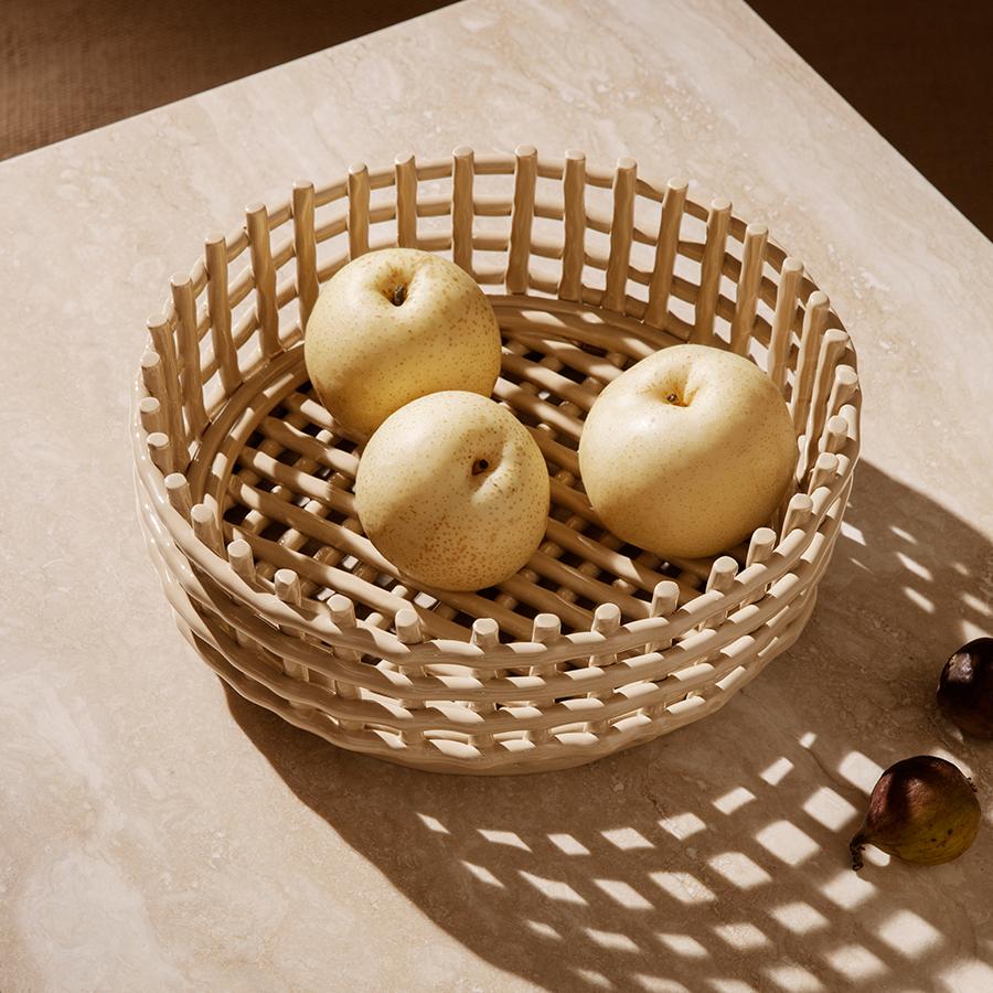 伝統的なバスケットの編み方を陶器に取り入れたハンドメイドのプロダクトです。すべてが職人の手作業によって作られるため、同じものは2つとしてありません。表面に見られる凹凸はやカーブは、唯一無二の味わいです。遊び心あるデザインは、リビングや、ダイニング、玄関・デスク周りのアクセントに。光に当たると影が格子状になり、綺麗な表情を見せてくれます。大きな円形のセンターピースはフルーツバスケットにしたり、側面の美しさを利用してシェルフに配置しても素敵です。