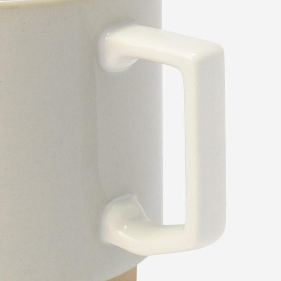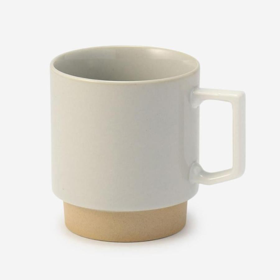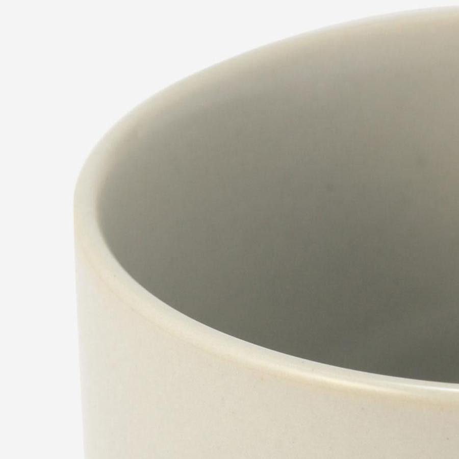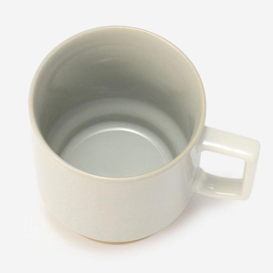 まるで土でできた陶器のような風合いの素地ながら、磁器(石粉)で作られたマグカップです。磁器は陶器よりも高温で焼くため、丈夫なのが特徴です。底面が窪んだデザインにしたことで、重ねて収納する事ができます。