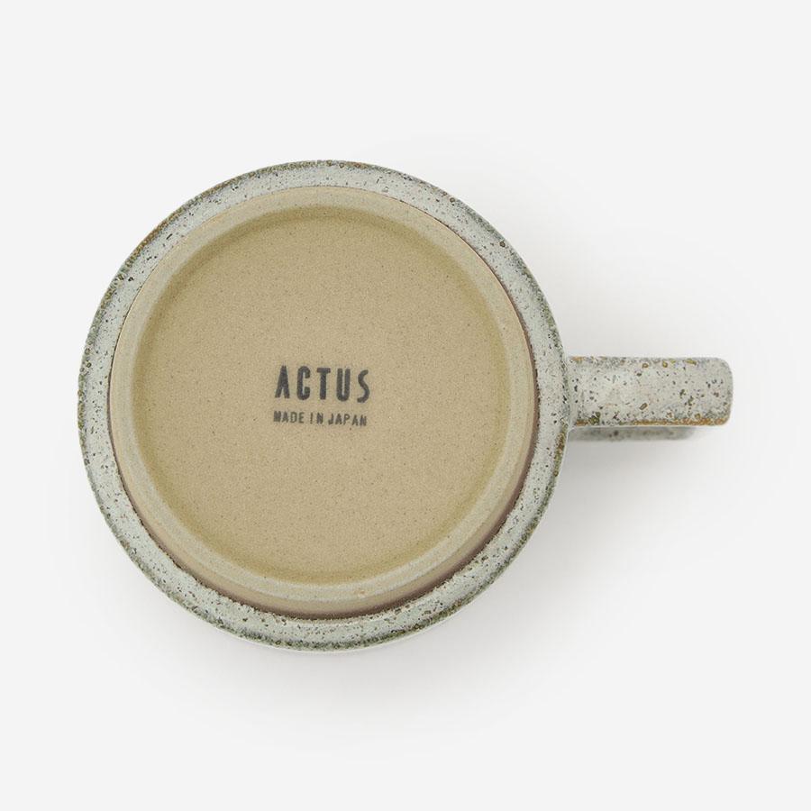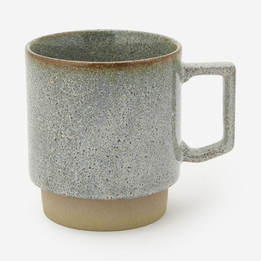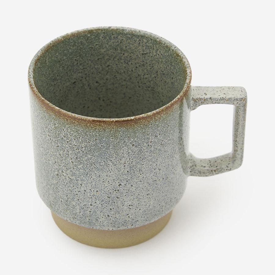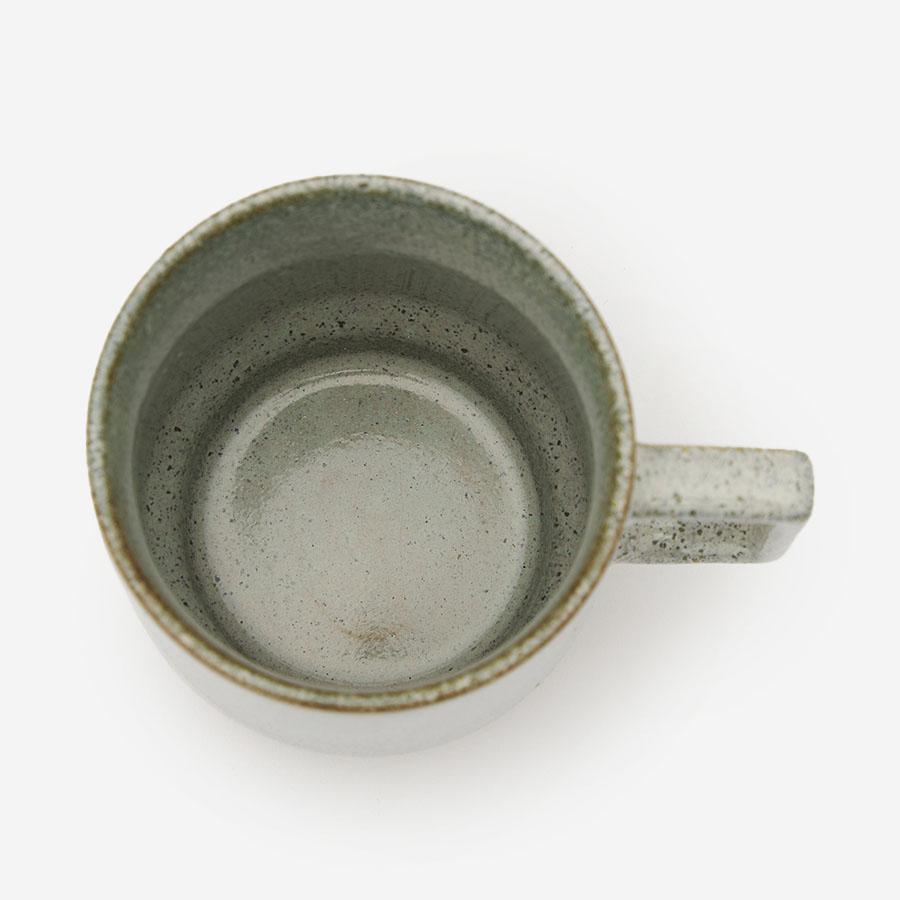 まるで土でできた陶器のような風合いの素地ながら、磁器(石粉)で作られたマグカップです。磁器は陶器よりも高温で焼くため、丈夫なのが特徴です。底面が窪んだデザインにしたことで、重ねて収納する事ができます。