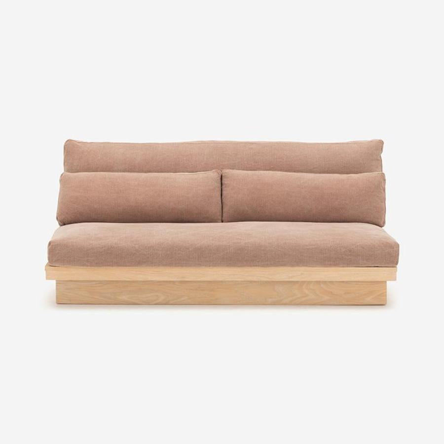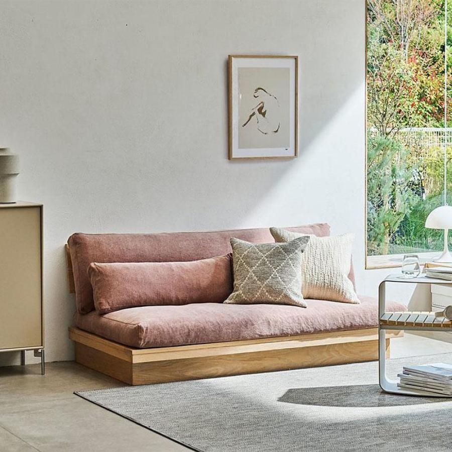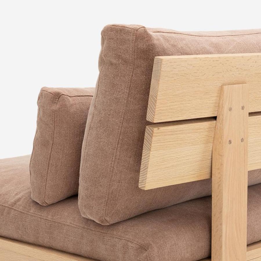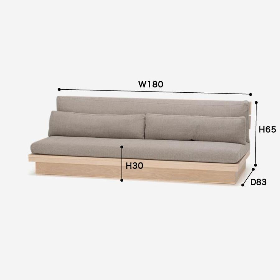 低座スタイルのどっしりとした印象のソファです。床に近いすわり心地は安心感と安定感があり、リラックスできます。フレームにはオークの無垢材を使用しており、背面からの見た目も美しく仕上がっています。