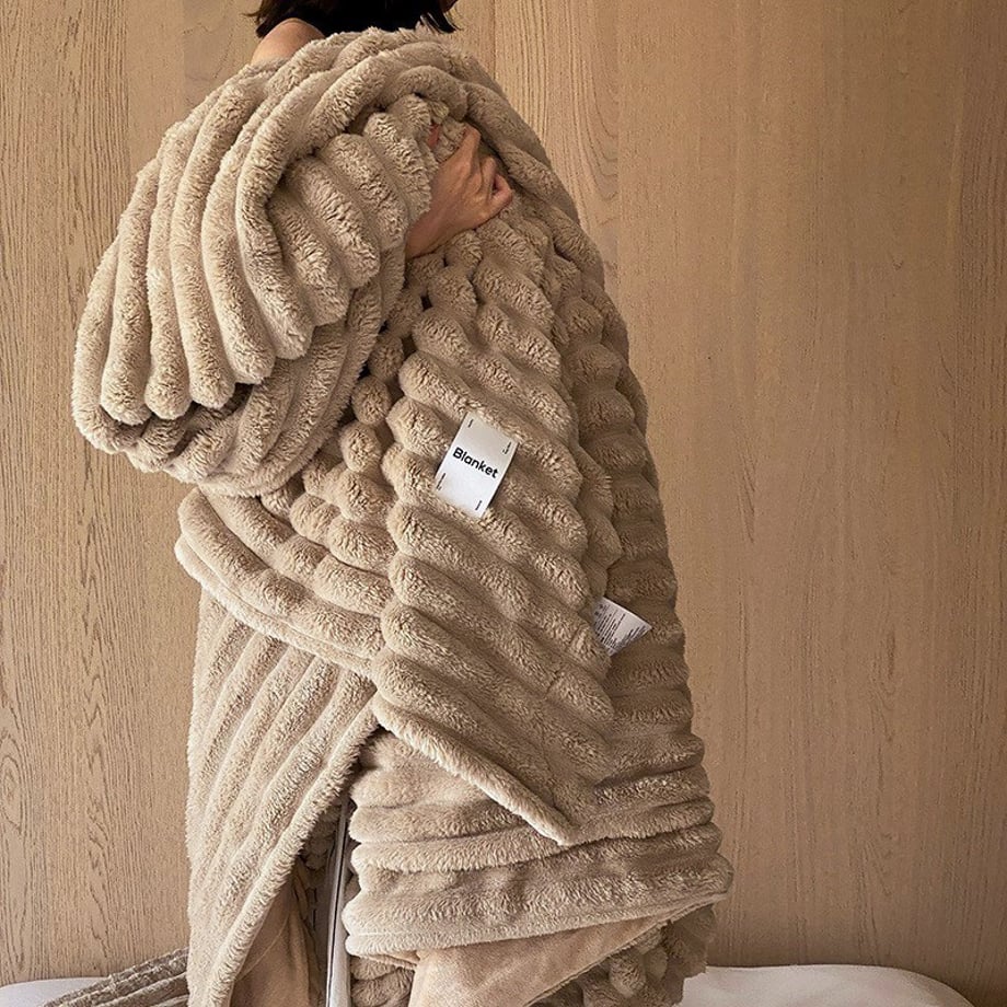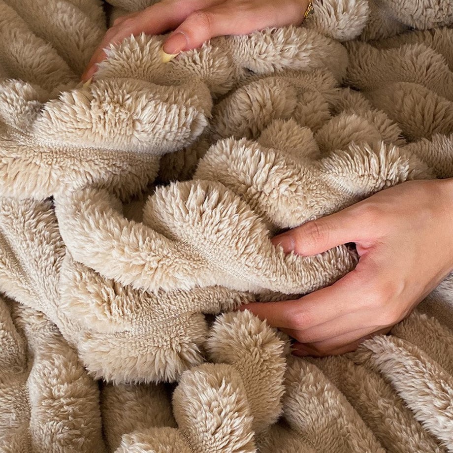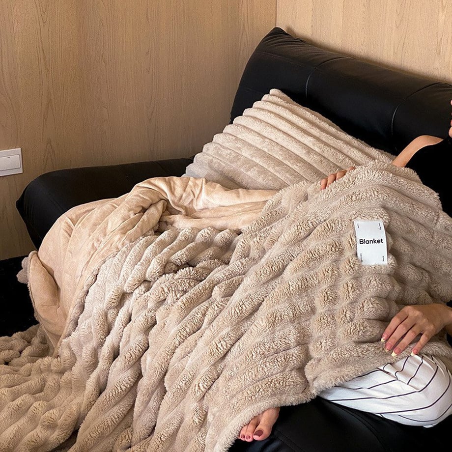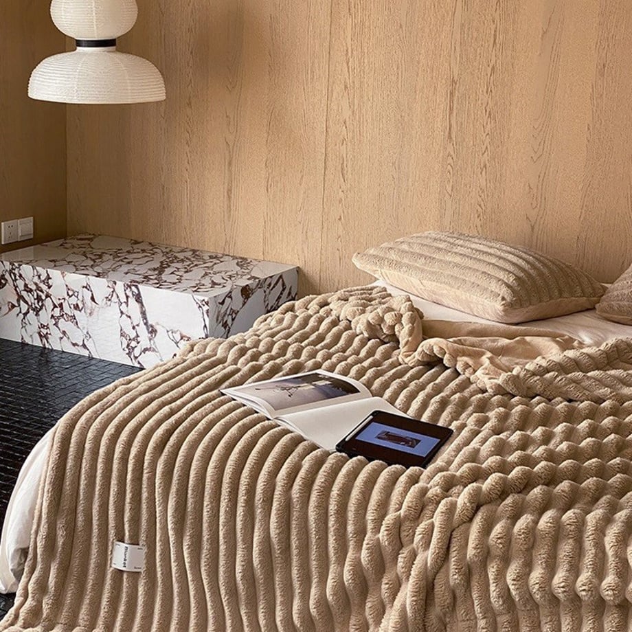 うさぎの毛皮のようなふわふわで柔らかいフェイクファーのブランケットです。ボリュームがあって肌触りが良く、包み込まれるような感覚であたたかく過ごせます。寝室やリビングのご自宅以外でも、車中やキャンプシーンなどにもおすすめです。