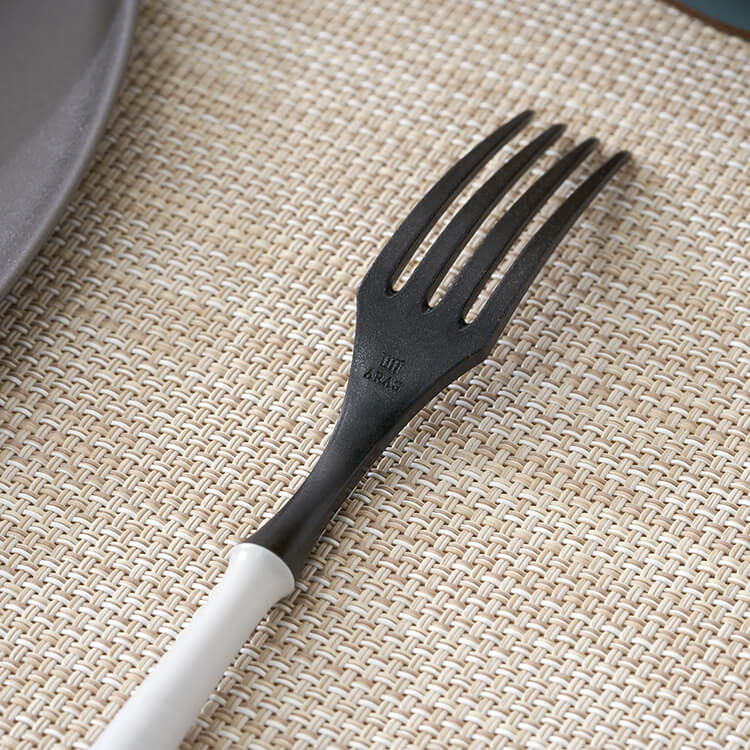 シンプルなデザインで、合わせる食器を選ばないカトラリー。お気に入りのお皿と一緒に使ってもお皿を傷つけにくい優しい設計、永くお使いいただけます。「強く、美しい、カタチ。」をコンセプトとした食器ブランドARAS。永く使い続けてもらうために、ガラスと樹脂を掛け合わせた新素材を開発し、熟練した日本の職人の技術によってデザインを実現。環境に優しく、暮らしを豊かに彩る新しい食器です。洗練されたモダンなデザインが魅力。デザインが良いだけでなく、その使いやすさも人気の一つです。樹脂ならではのソフトタッチでカチカチという音もなく、お料理を楽しんでいただけます。