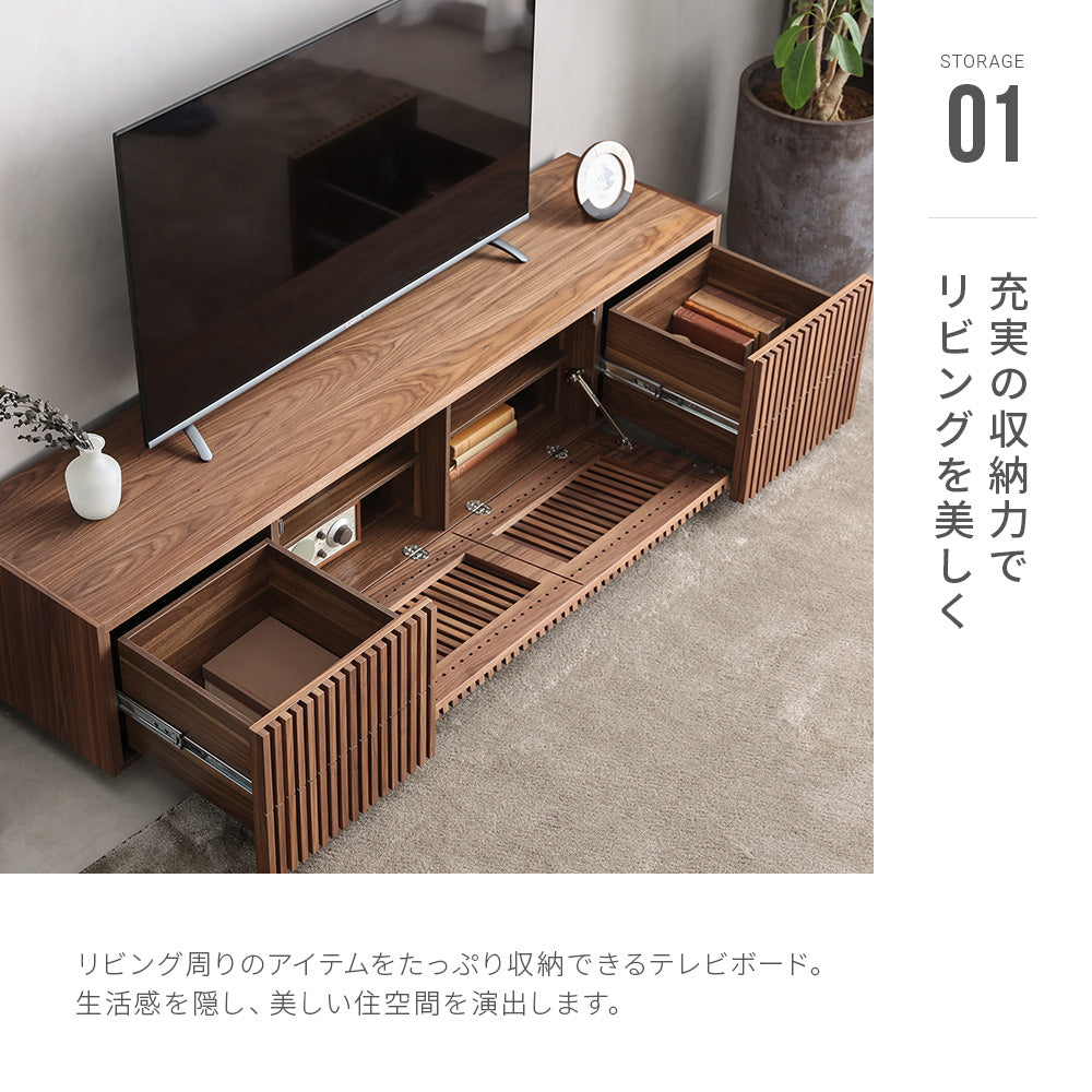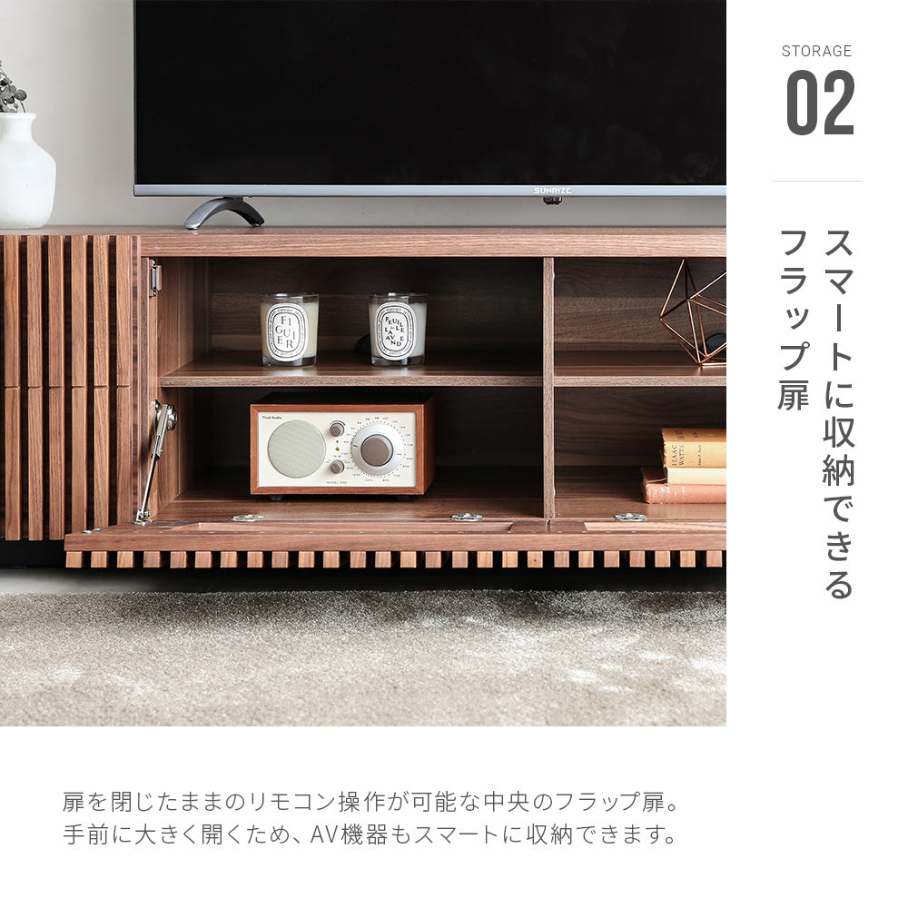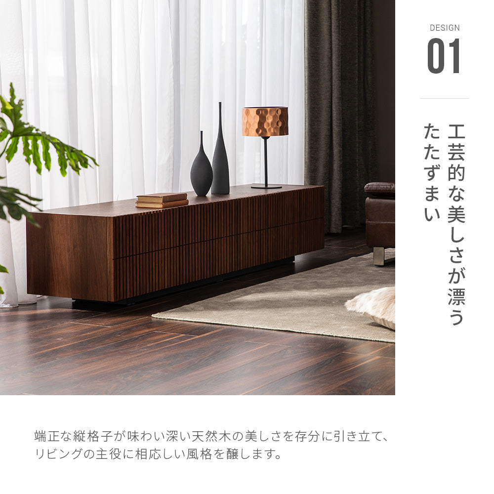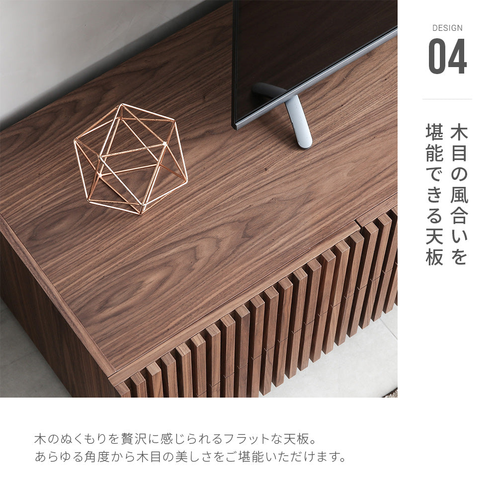 木目の存在感を活かした優美なルーバーデザインのテレビボード。時代に流されない端正な佇まいが長く愛される一台です。