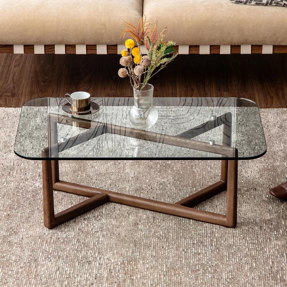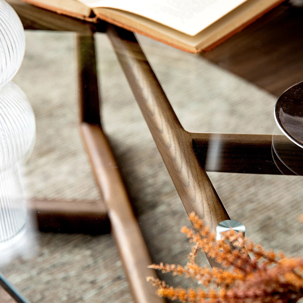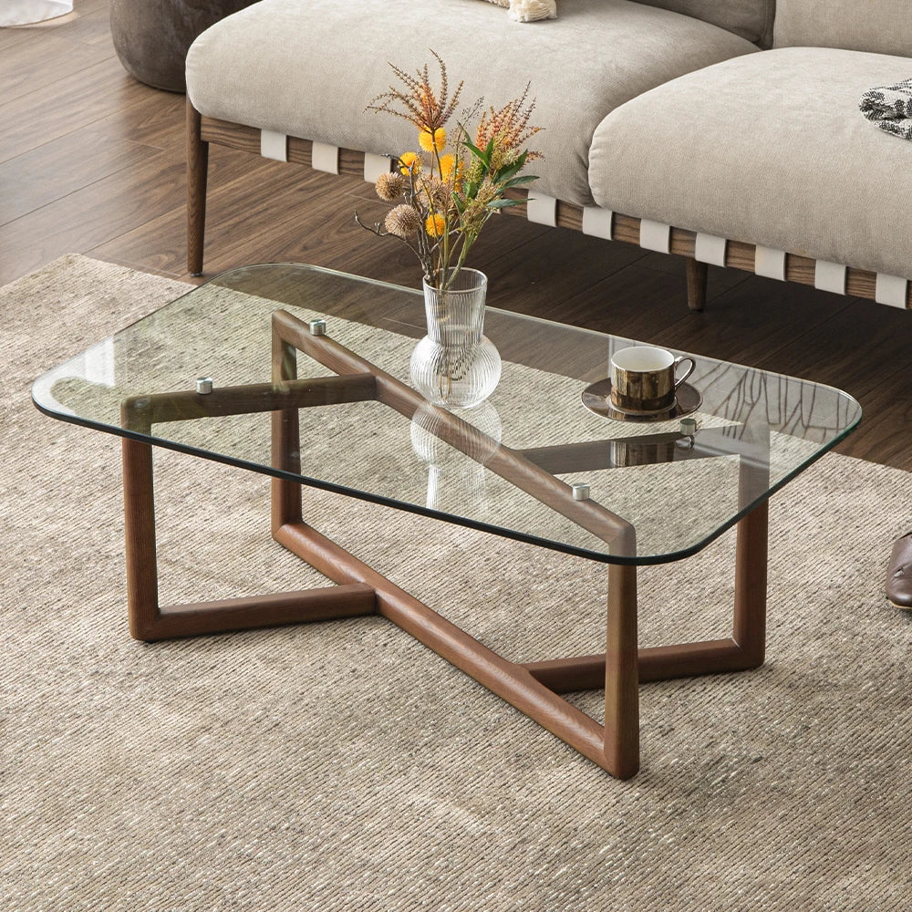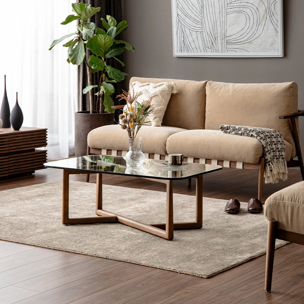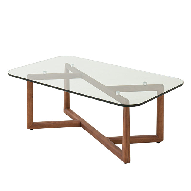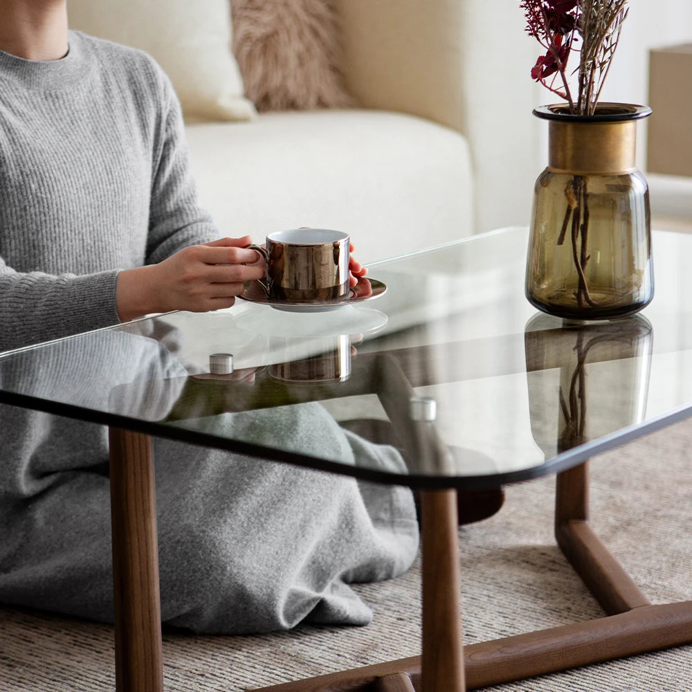 透き通るガラス天板と天然木フレームが美しく調和するリビングテーブル。現代的で洗練された空間作りを叶えます。