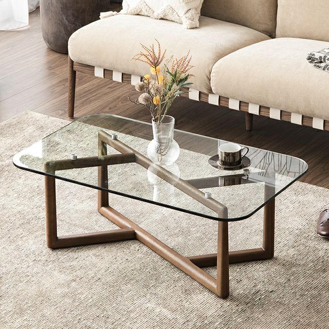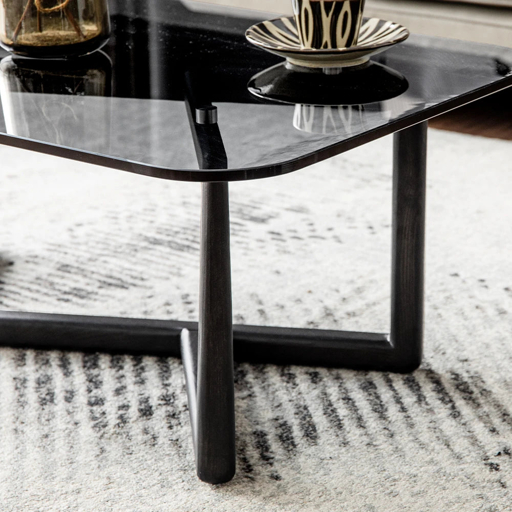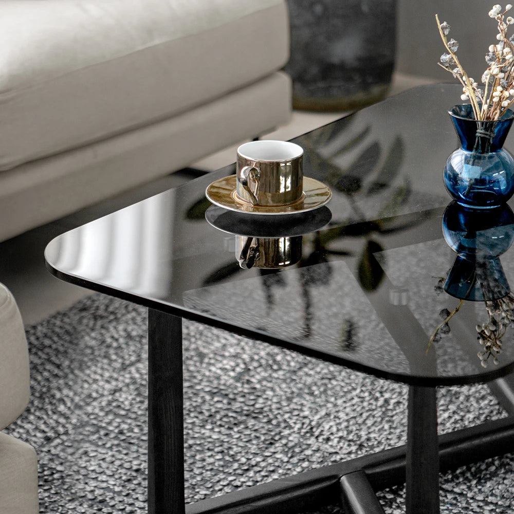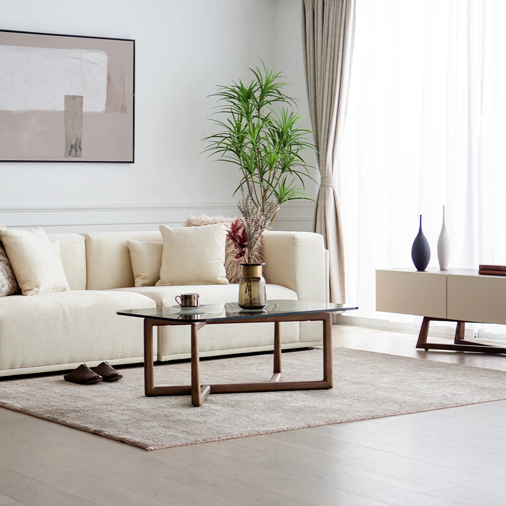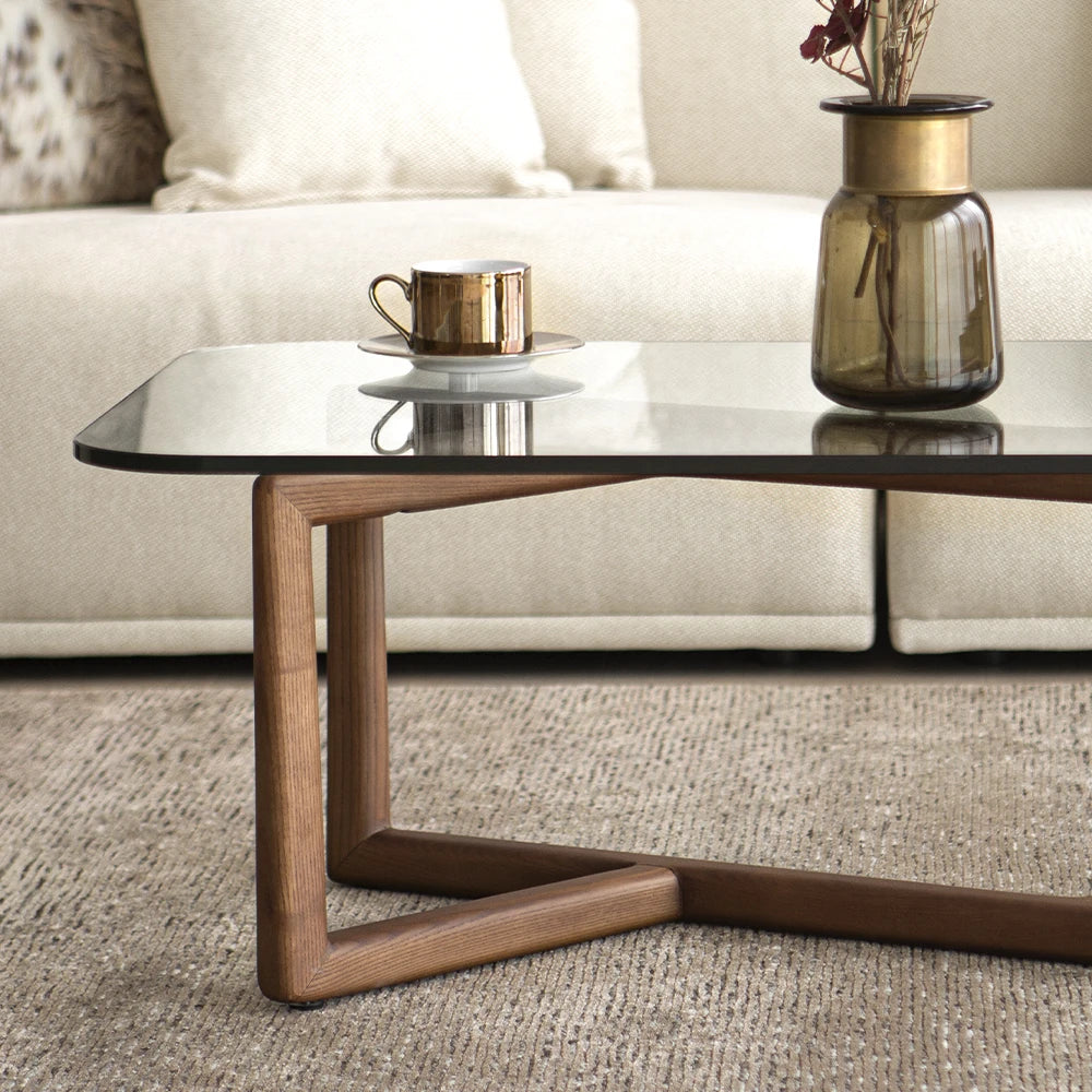 透き通るガラス天板と天然木フレームが美しく調和するリビングテーブル。現代的で洗練された空間作りを叶えます。