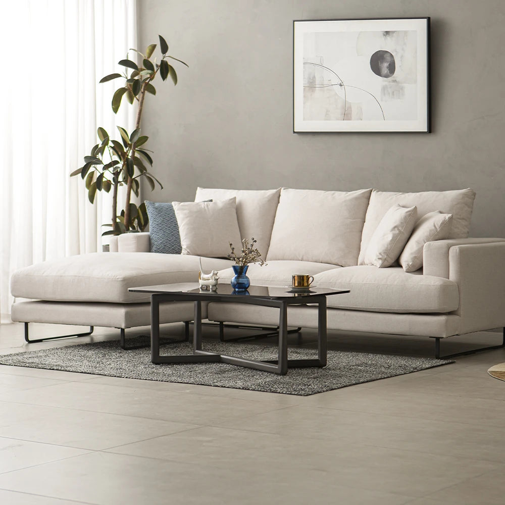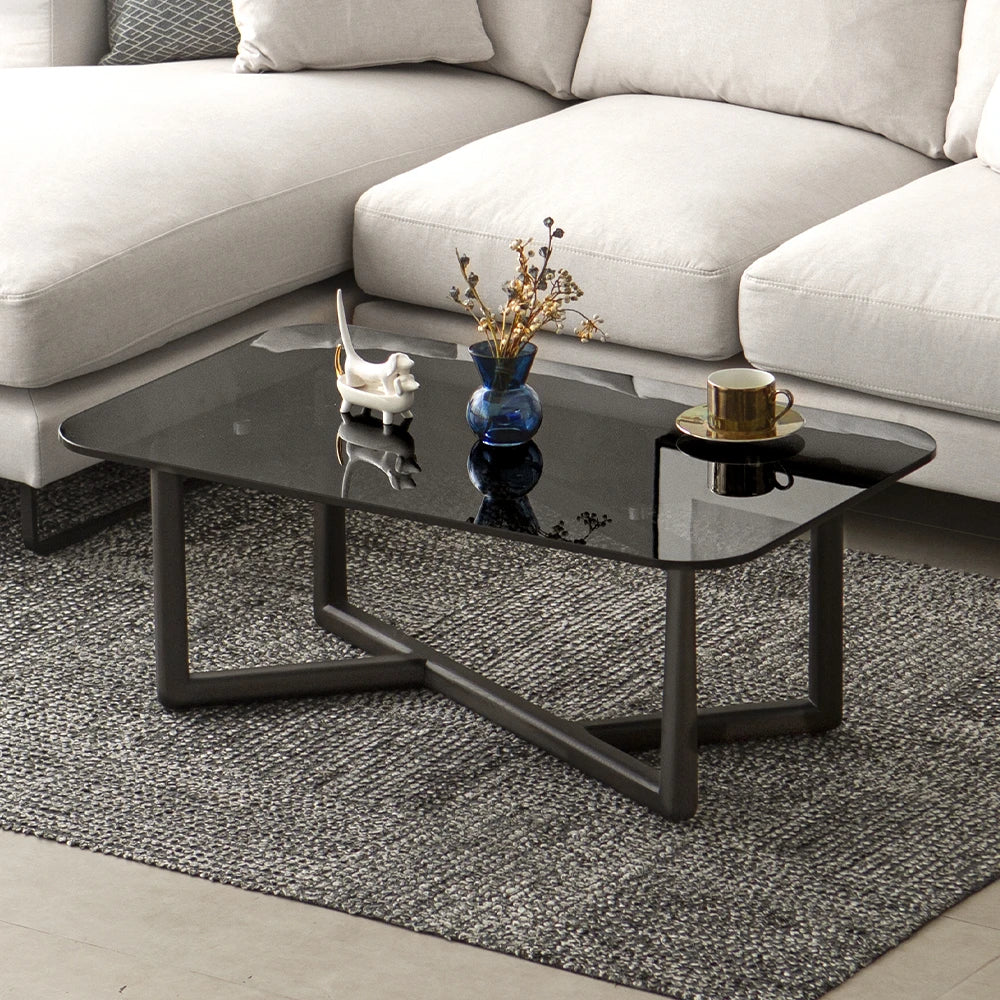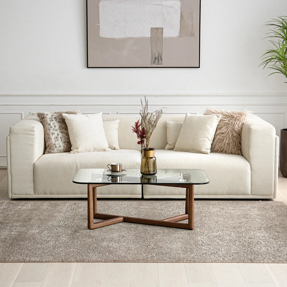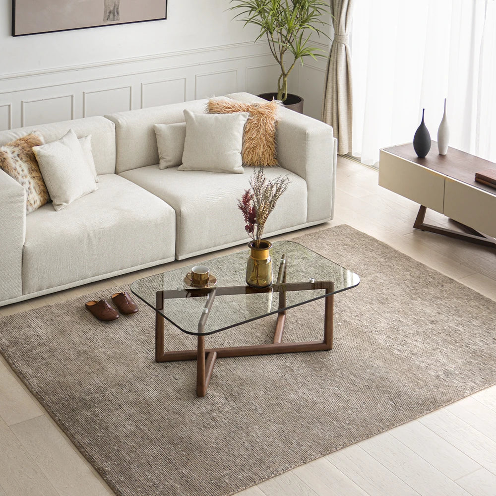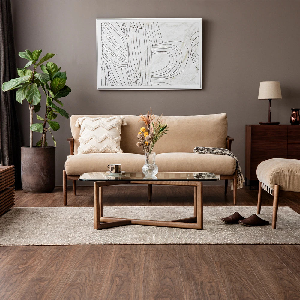 透き通るガラス天板と天然木フレームが美しく調和するリビングテーブル。現代的で洗練された空間作りを叶えます。