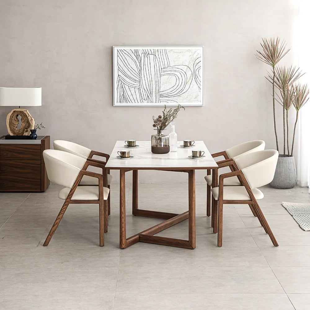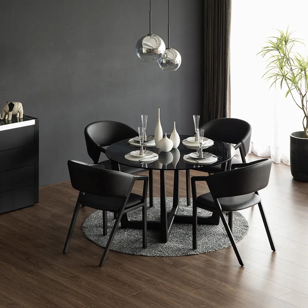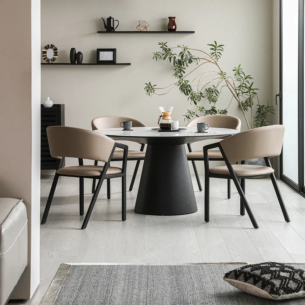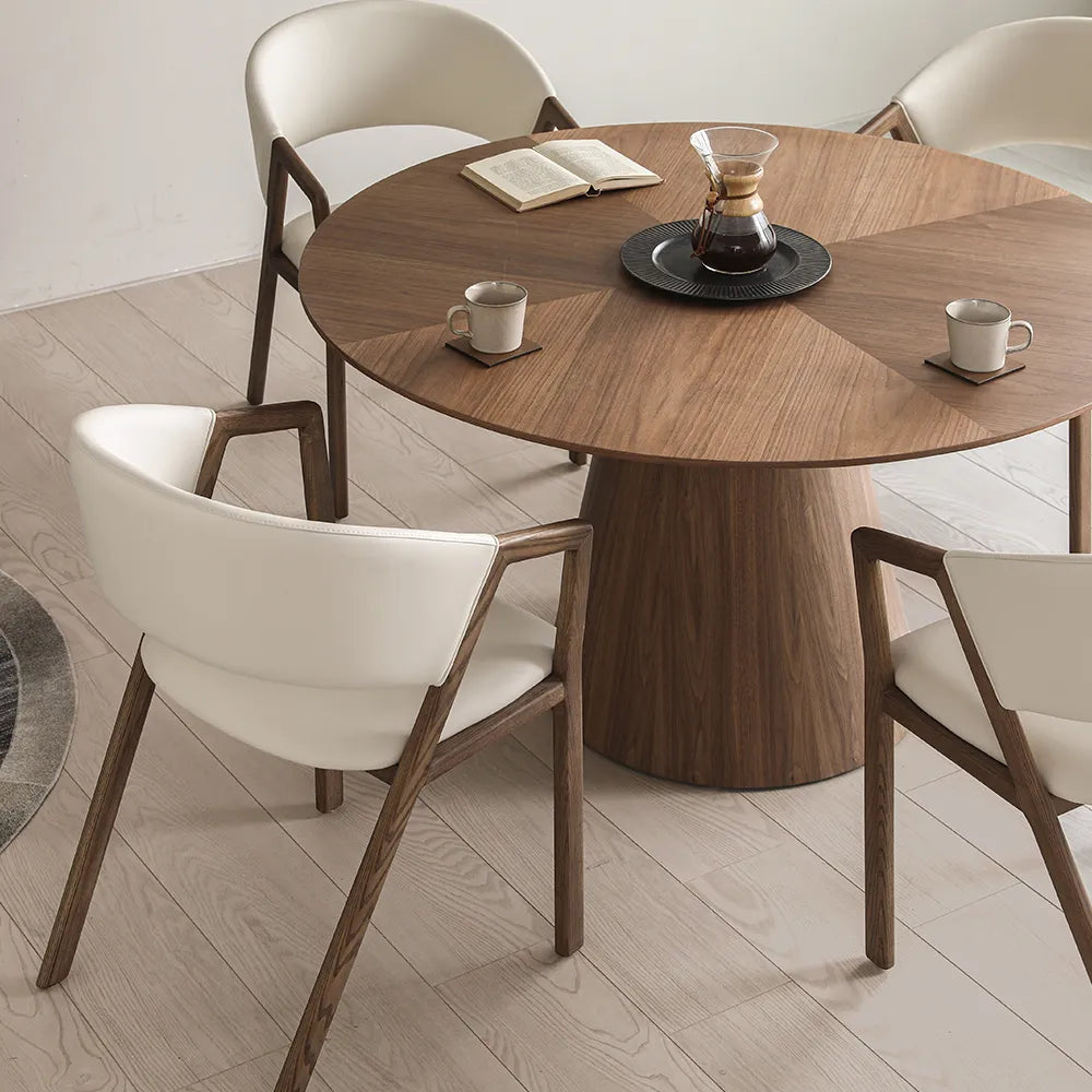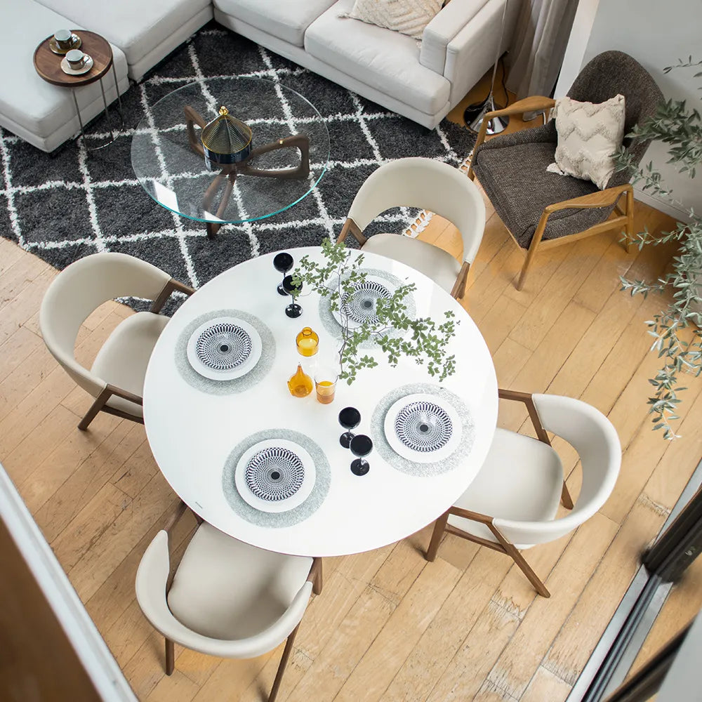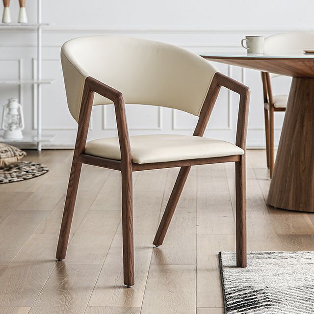 体を包み込むようなラウンドしたフォルムが優美なダイニングチェア。素材の豊かな風合いと快適性に満たされる一脚です。