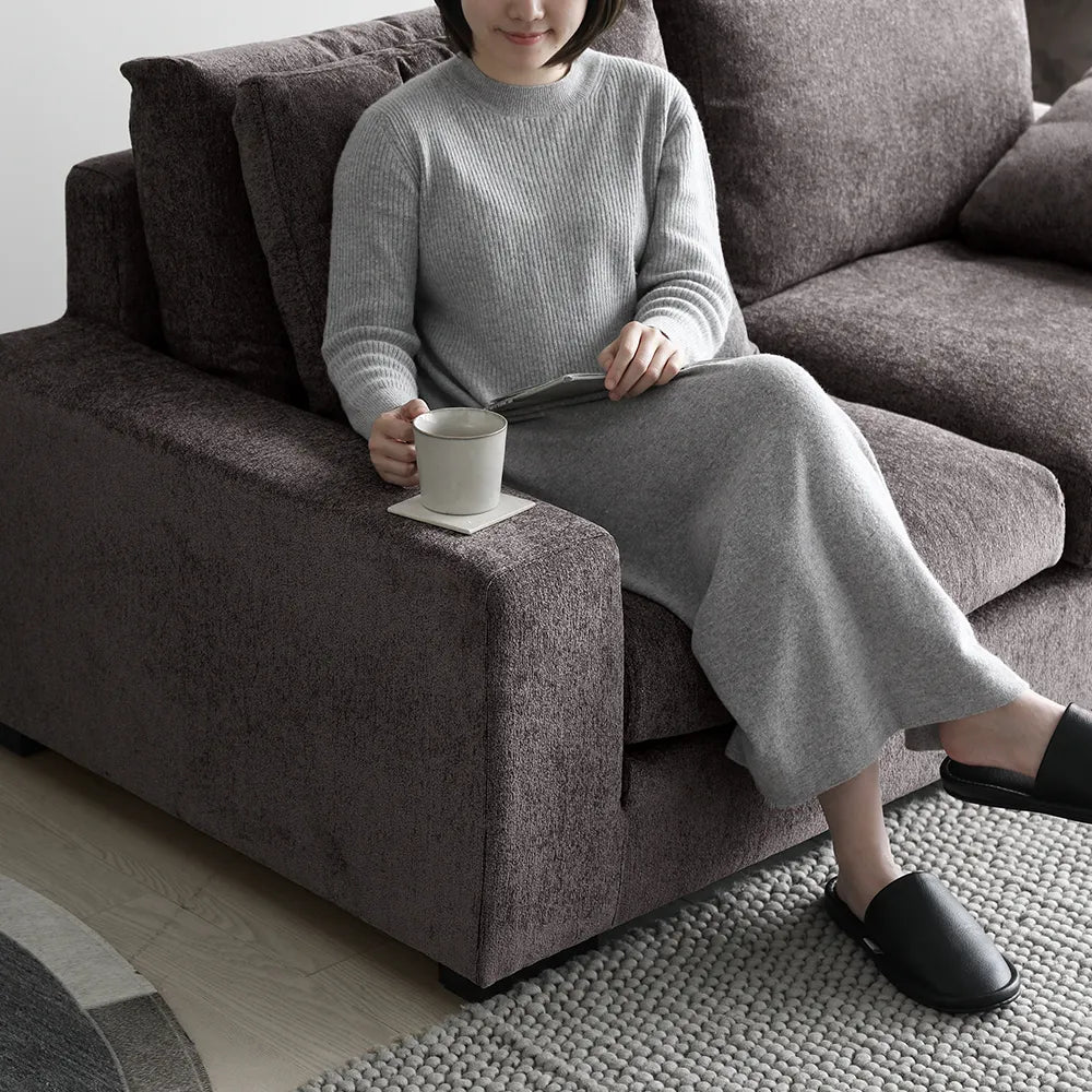 背面、座面クッションの両側から全身を包み込むように受け止めるローソファ。上品な佇まいと座り心地の両方を兼ね備えた逸品です。