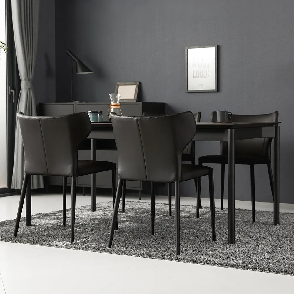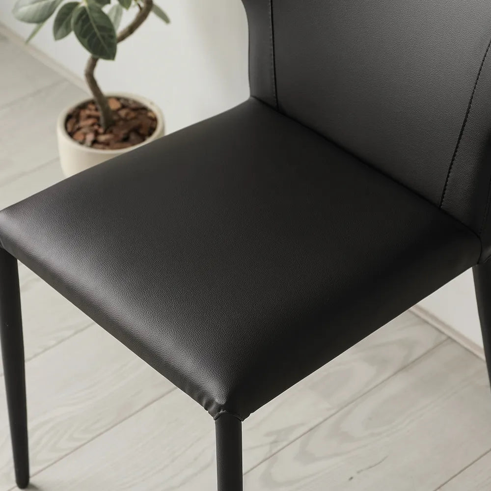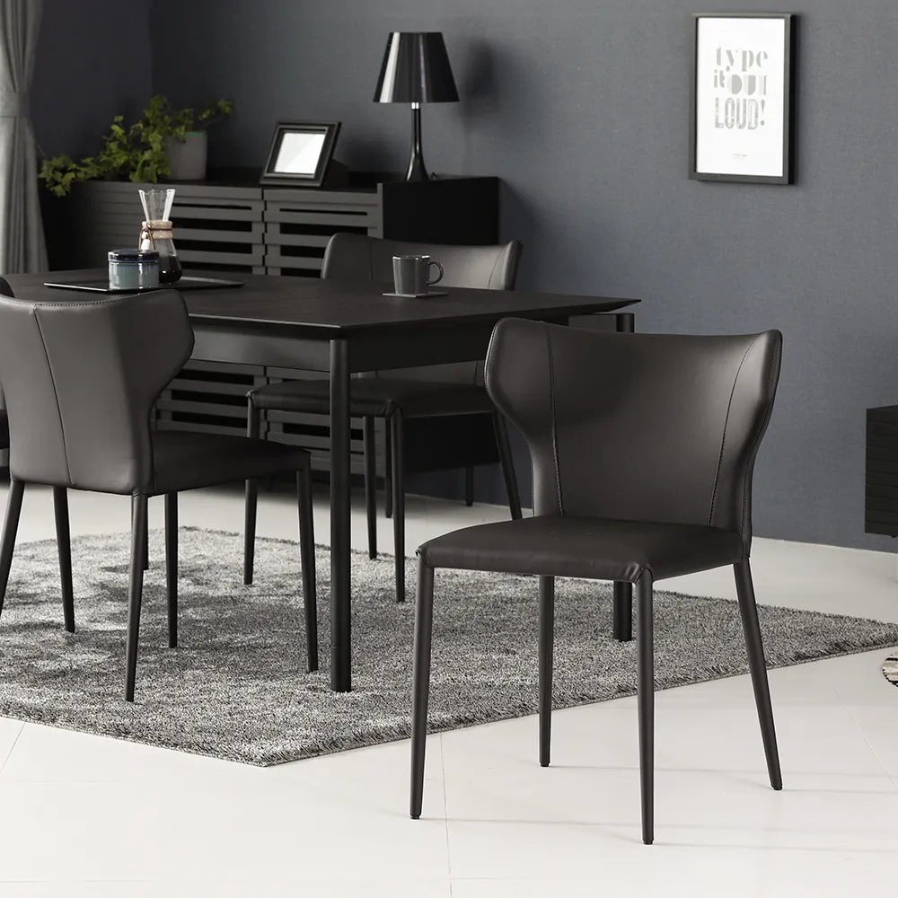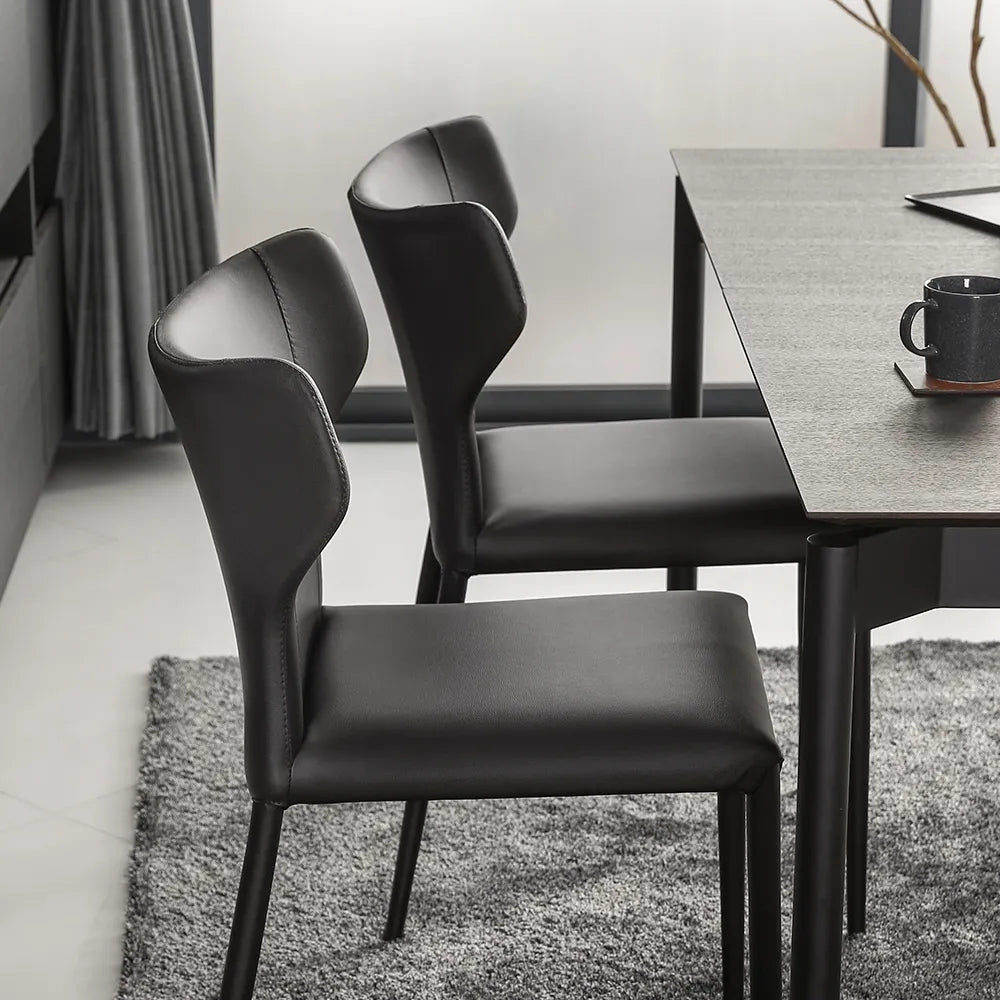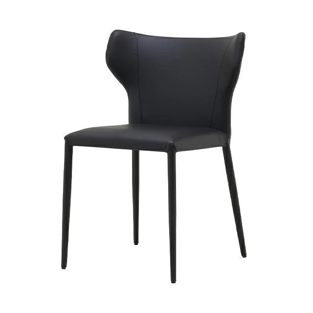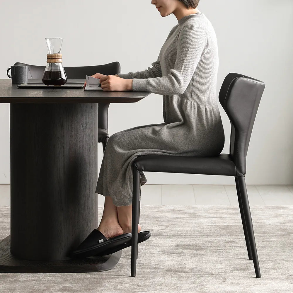 重厚なレザーが存在感を際立たせるモダンシルエット。洗練された大人の空間を創るダイニングチェアです。