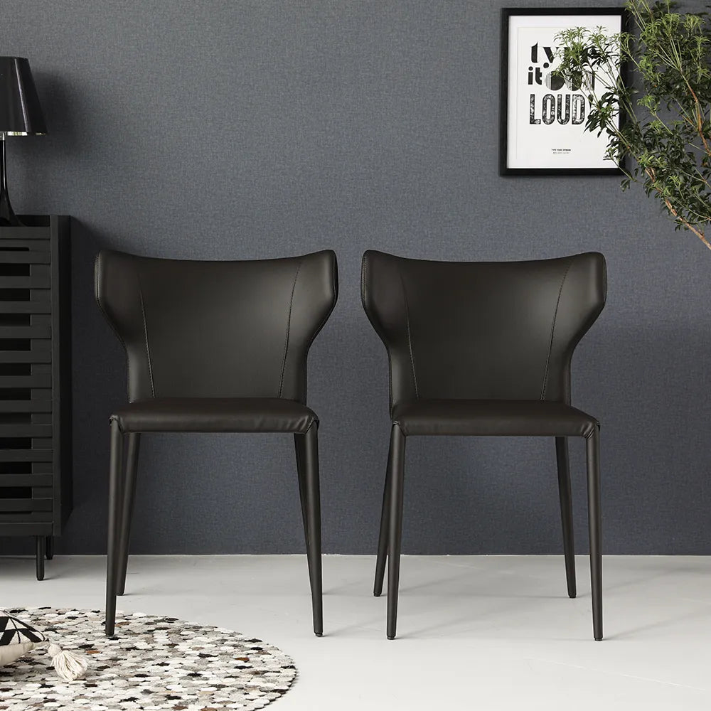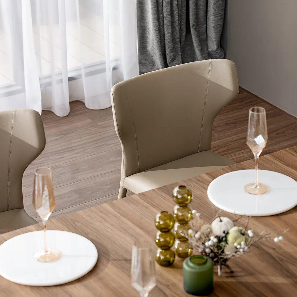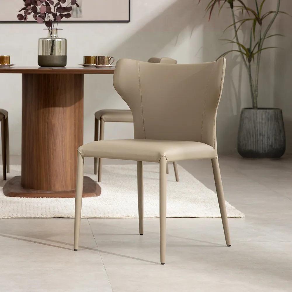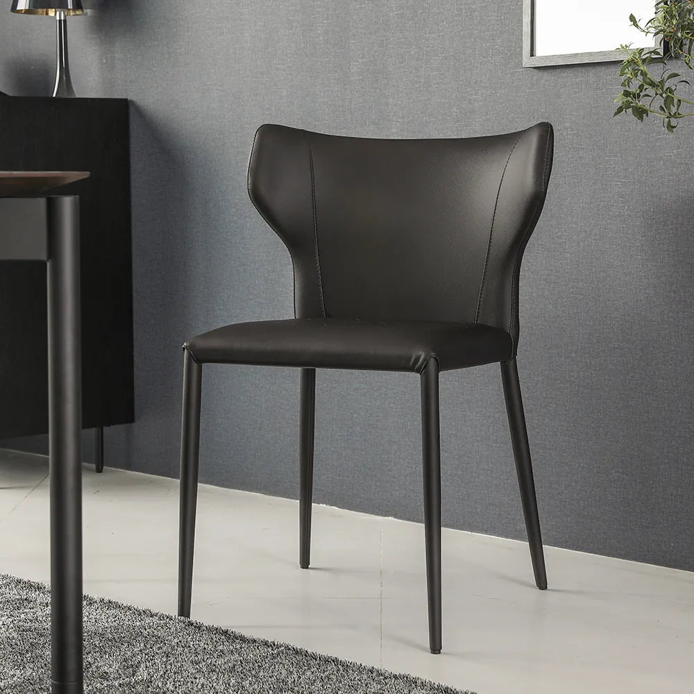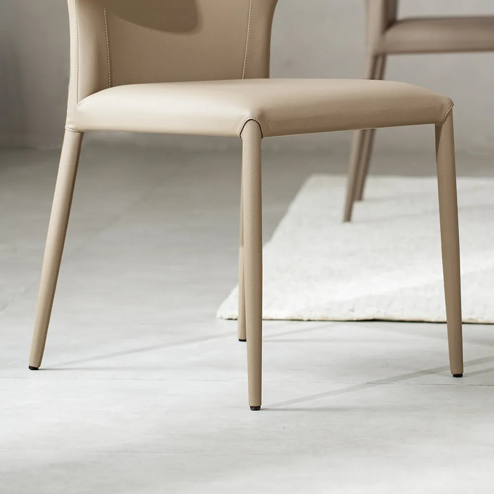 重厚なレザーが存在感を際立たせるモダンシルエット。洗練された大人の空間を創るダイニングチェアです。