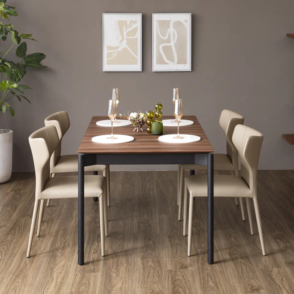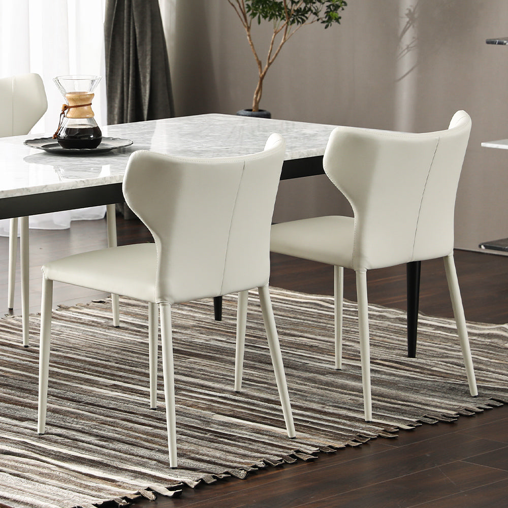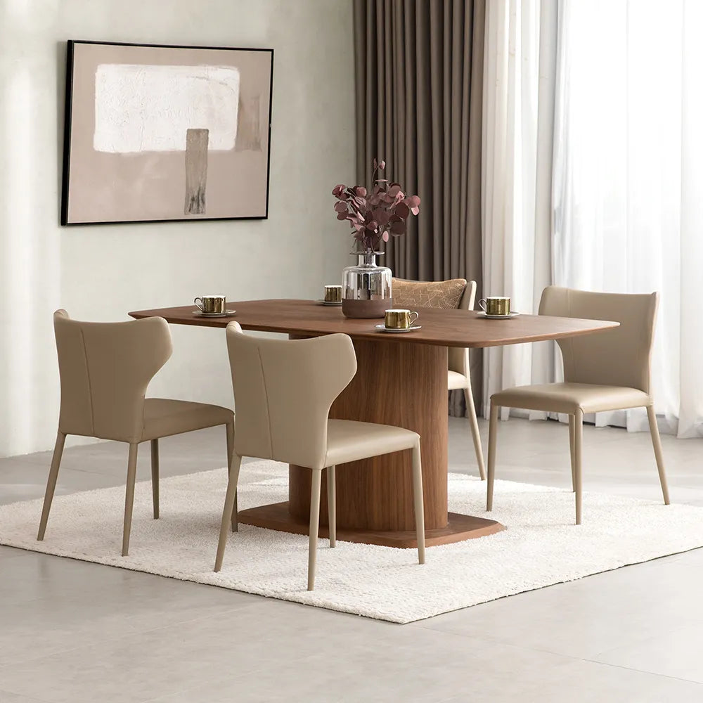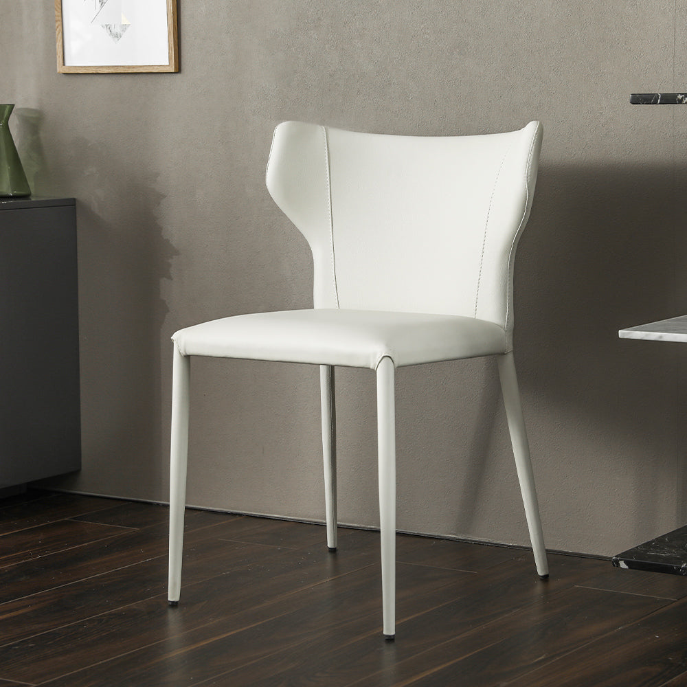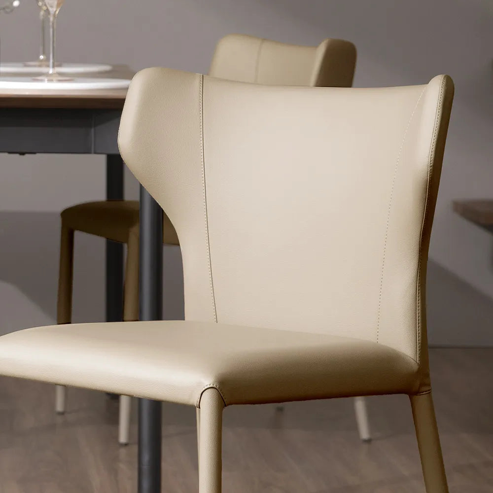重厚なレザーが存在感を際立たせるモダンシルエット。洗練された大人の空間を創るダイニングチェアです。
