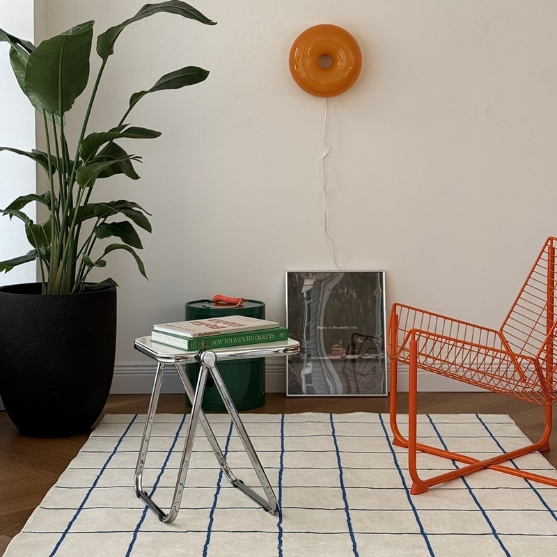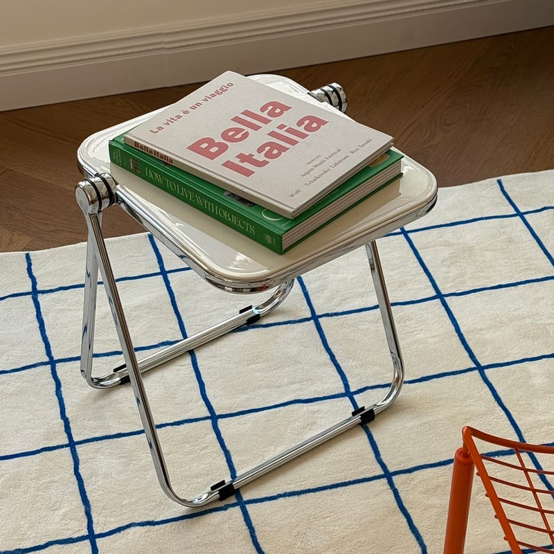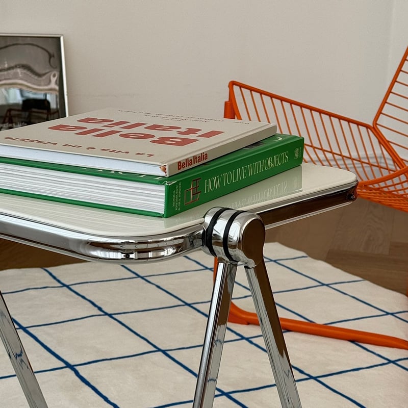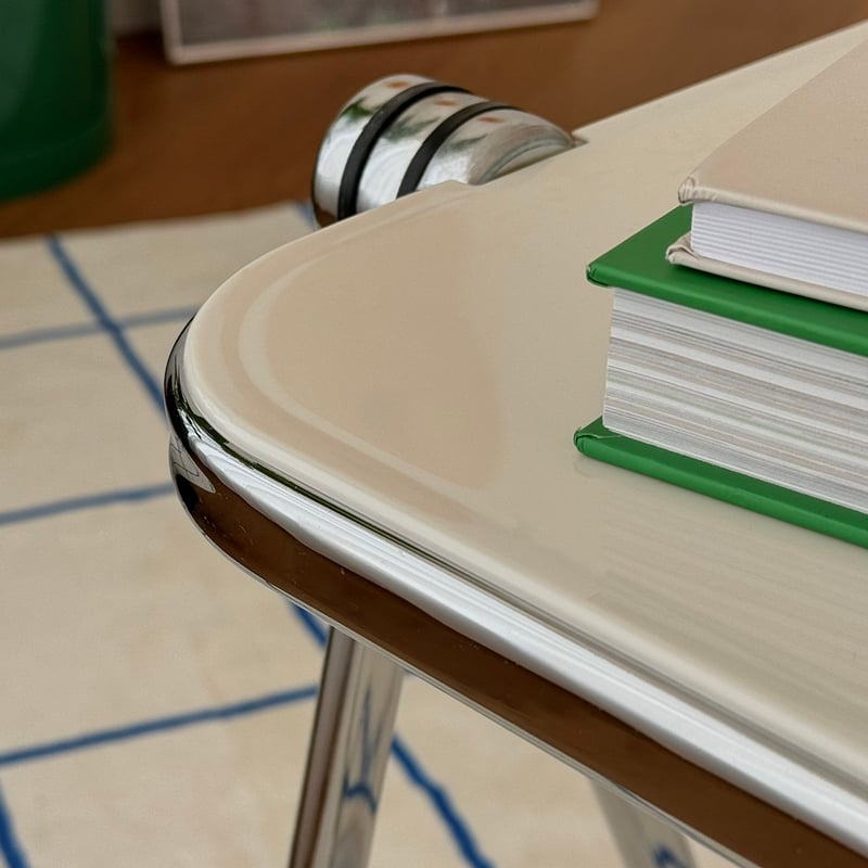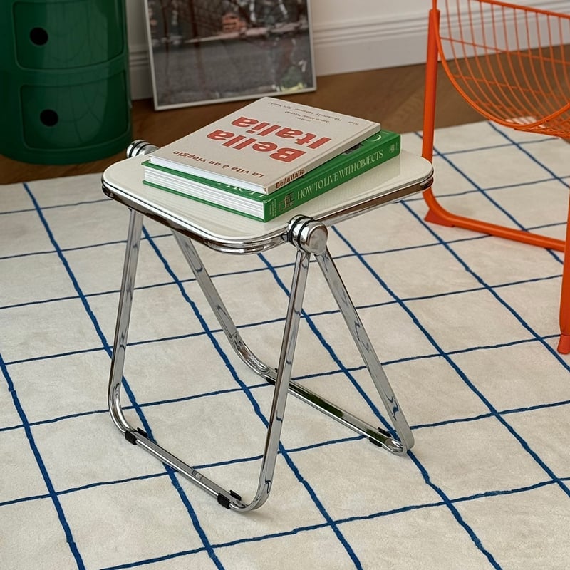 メッキ加工がされたシルバーフレームと、アクリルの天板が組み合わさったサイドテーブルです。無駄のないシンプルなデザインで、都会的な印象を与えます。使わないときは折り畳み保管ができ、厚さ約5cmのフラットな形状になります。来客の際やスペースの限られたお部屋に便利なインテリアアイテムです。