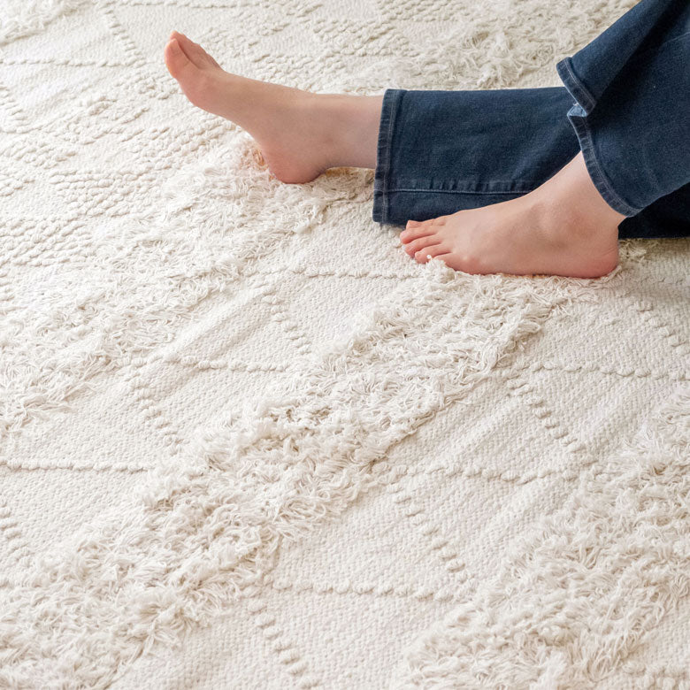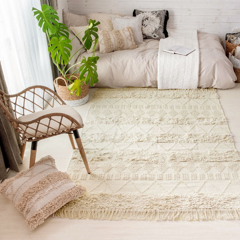 ぽこぽことした編み目が可愛らしい、ボヘミアン柄ラグです。サイドに施された長めのフリンジと毛足の長さにこだわった立体的な織りで、ワンカラーでも華やかなデザインになっています。ボーホースタイルやモロッカンスタイルなど、女性らしいコーディネートによく合います。