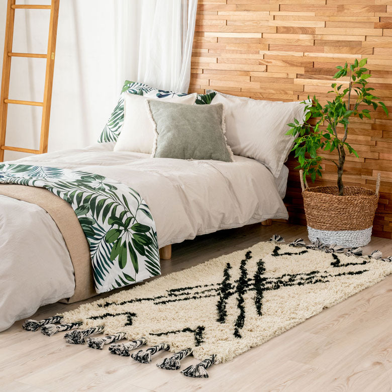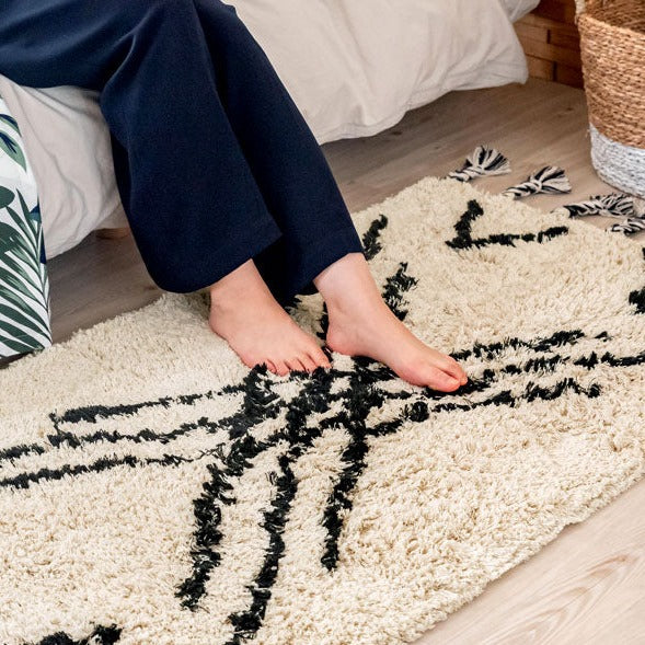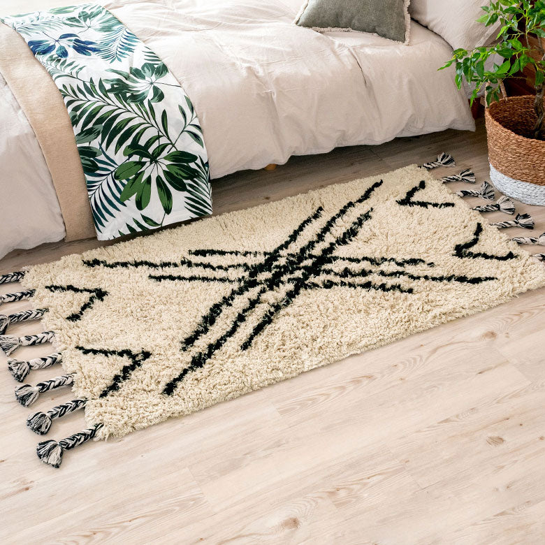 ベニオワレン風で、たっぷりのパイルで作られたふかふかのラグマットです。サイドに施された大ぶりのタッセルと大胆なモノトーンデザインで、コーディネートの主役になります。長さのある毛足で、夏場はベタつかず冬はふんわりとあたたかく使用できます。