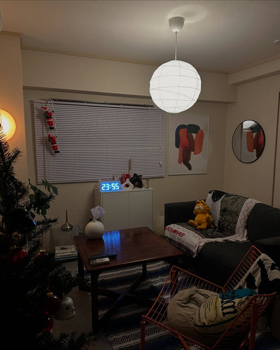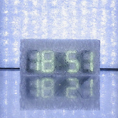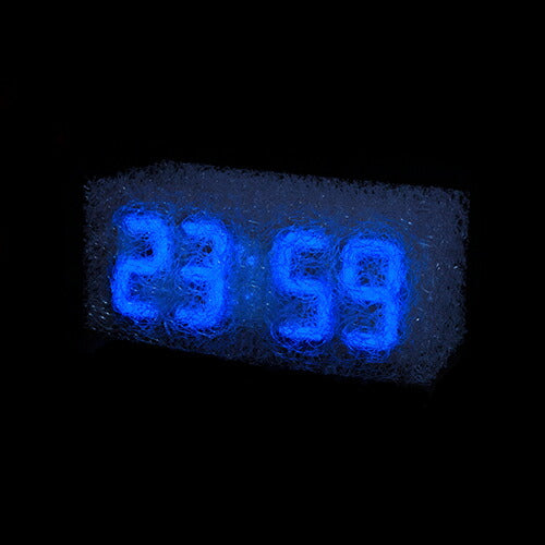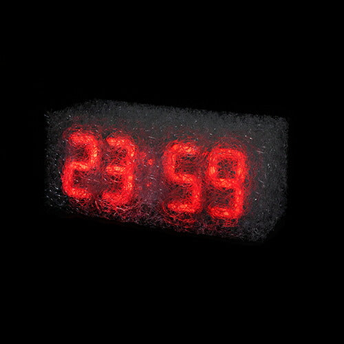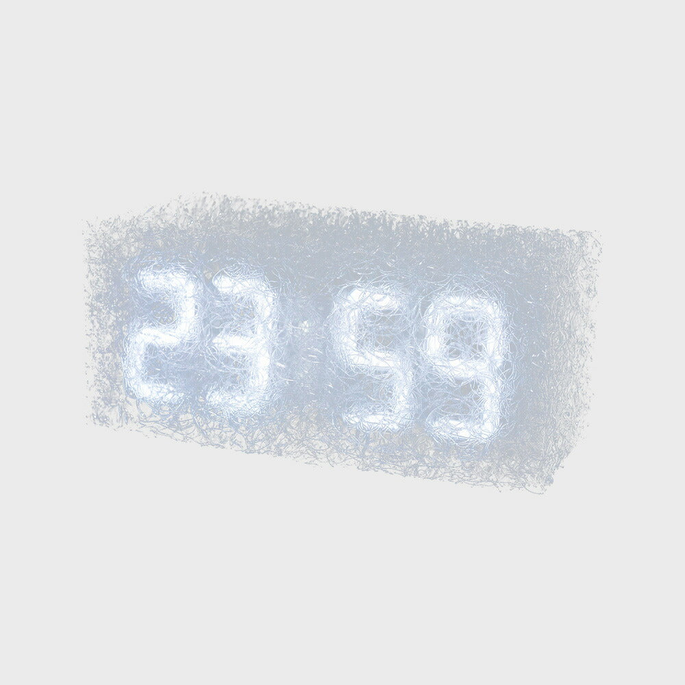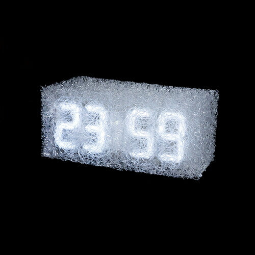 雲や霧のようにも見える樹脂製新素材が独特の浮遊感・透明感を感じさせ、その中で灯るネオンカラーのデジタル時刻表示が、まるでモダンアートのようなデジタル時計です。同時に、1970年代に近未来の管理社会を描いた「時計仕掛けのオレンジ」を思い起こさせるレトロフューチャーな印象もあります。明るさ調整機能やアラーム機能が付いているので、目覚まし時計にもぴったり。