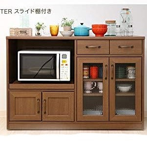 家電を置いてもラクに引き出せるスライドレール付きの食器棚です。蒸気の出る炊飯器やポットなどの設置にピッタリです。キッチン周りをスッキリ収納できる、広々とした扉収納スペースがあり、鍋やストック食材などのかさばる物もまとめて収納できます。