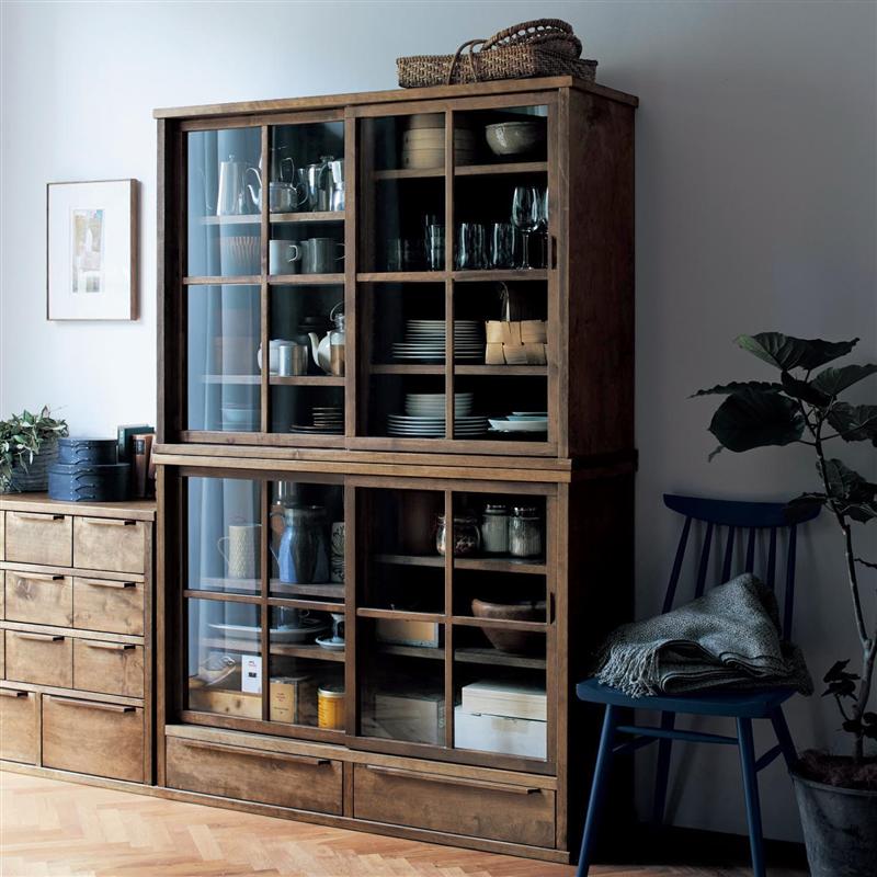 昔ながらの水屋箪笥をショーケース風にアレンジした食器棚です。天板の連結穴をなくし、より綺麗な見た目になったリニューアルバージョンです。インテリアとしての満足感をより感じていただける商品となりました。