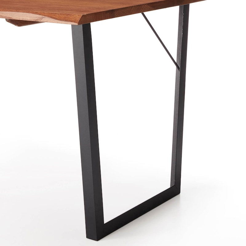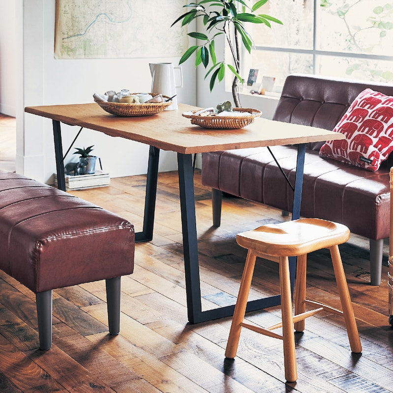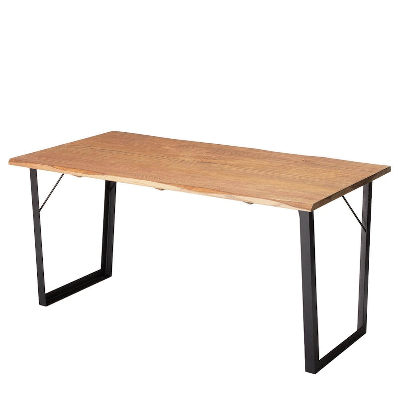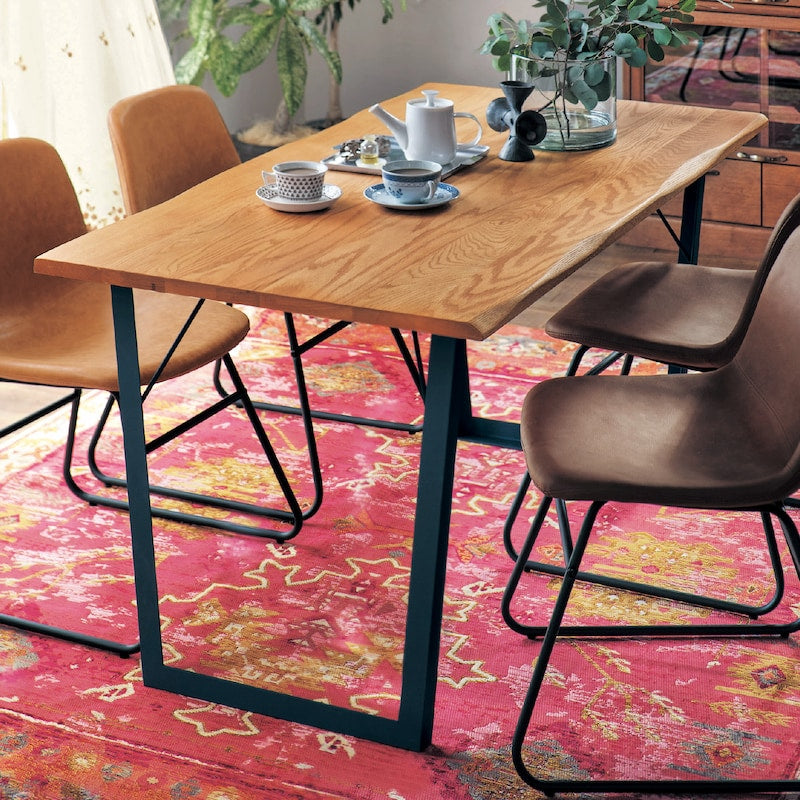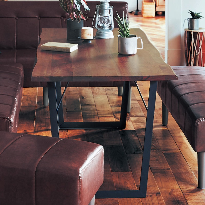 天然木とスチールを使用した一枚板風のダイニングテーブルです。天然木の集成材で一枚板風に仕上げたシンプルなテーブルで、天板の木口はまるで丸太を切り出したような加工をほどこしています。ナチュラルで重厚感のある雰囲気の仕上げています。