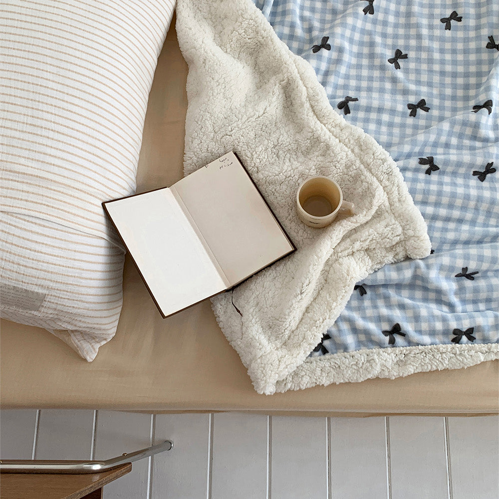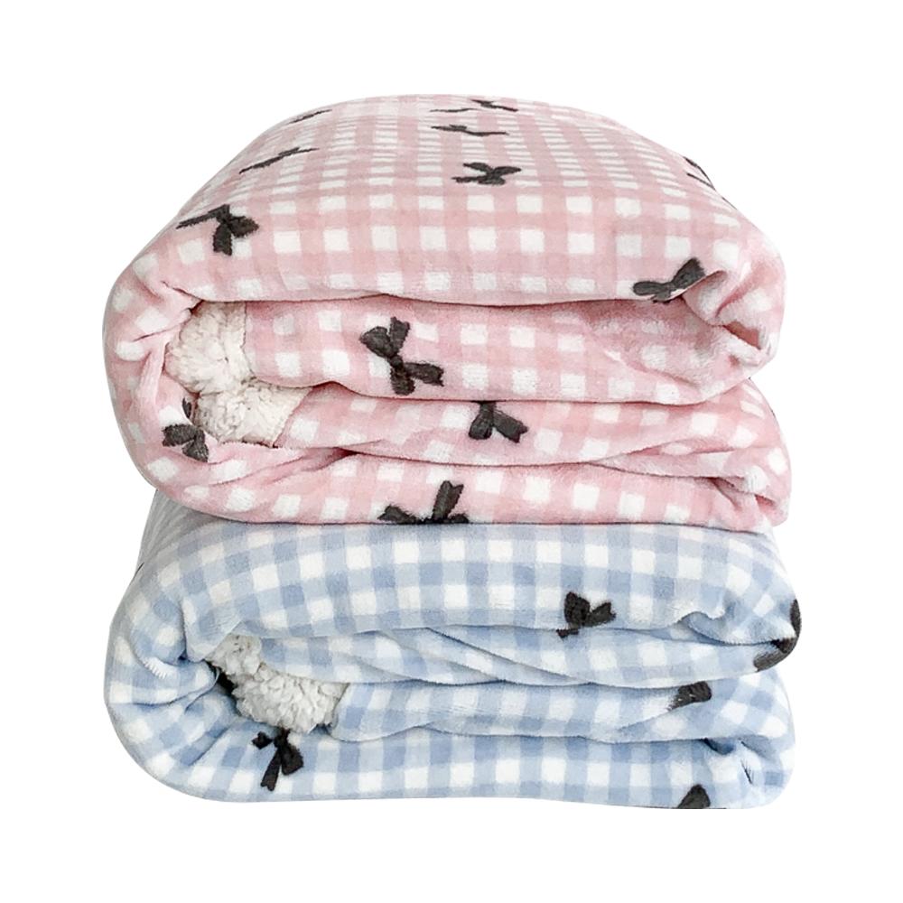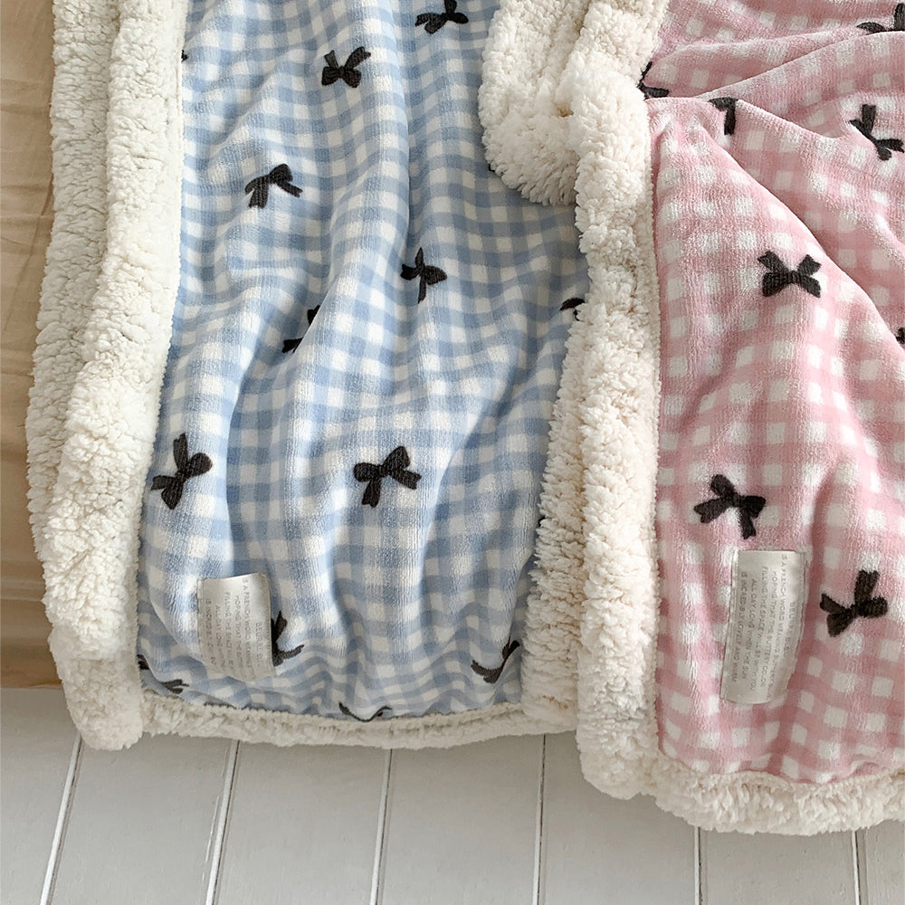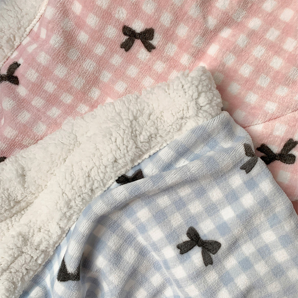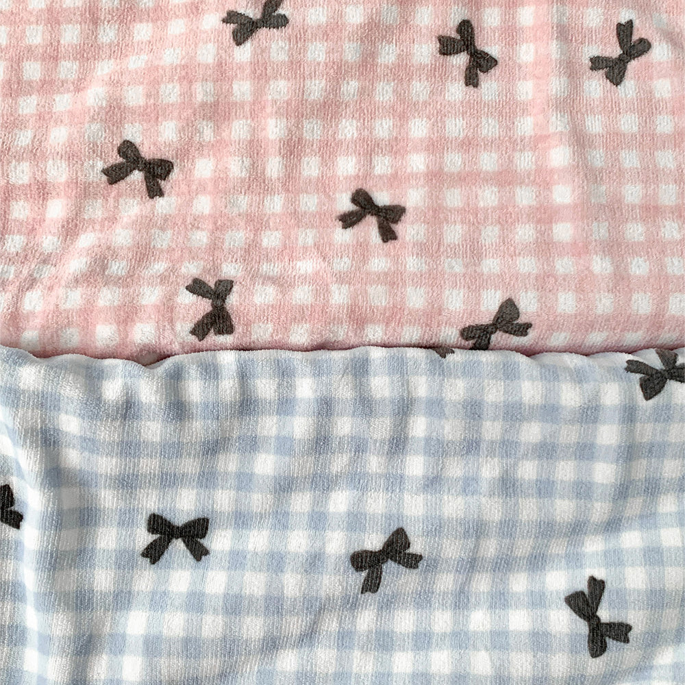 Beurre Bleuのスナッグブランケットは、ふんわりとした肌触りとリボン付きチェック柄が魅力です。ピンクとブルーの2色展開です。