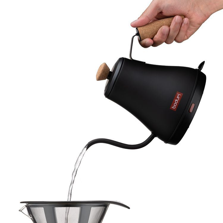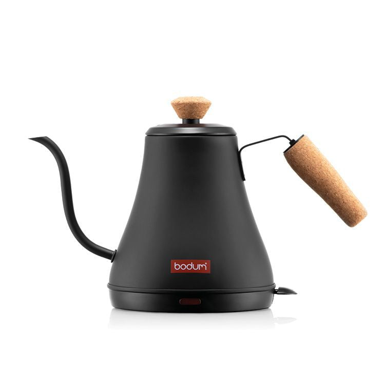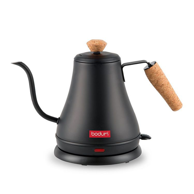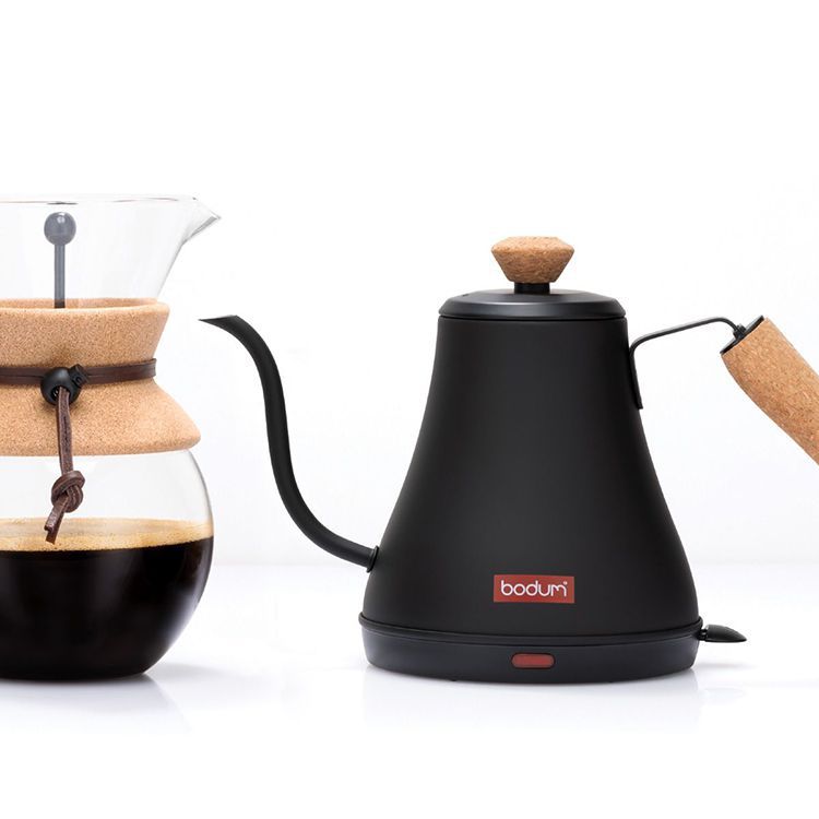ハンドドリップコーヒーにオススメのウォーターケトル。素早くパワフルにお湯を沸かし、注ぐ際には湯量をコントロールできます。淹れたてのコーヒーをご自宅でお楽しみいただけます。ボダムは、1944年創業、北欧デンマーク生まれのキッチンウエアブランド。デザインだけでなく実用性に優れた商品は、世界55か国にまで広がり毎日の食卓で料理や素材の美味しさを引き立てています。スリムでエレガントな細身の注ぎ口。湯量を自在にコントロールできるため、むらなく豆を蒸らすことができ、ゆっくり、しっかりとコーヒーが抽出できます。お気に入りのコーヒー豆の豊かな味わいと香りを最大限に引き出してくれます。人間工学に基づく設計で、環境に配慮した天然コルクを使用した、滑りにくく非常に持ちやすく注ぎやすいハンドルです。