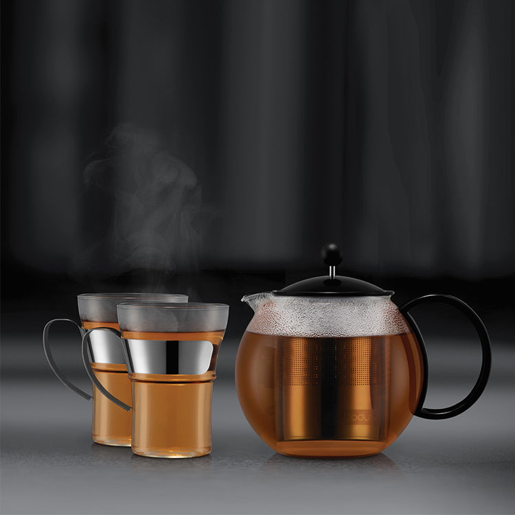 茶葉本来の瑞々しい味わいを引き出すフレンチプレスを採用した画期的なガラス製ティーポットです。美しさだけでなく実用性も備えているので、お茶好きの方におすすめです。ボダムは、1944年創業、北欧デンマーク生まれのキッチンウエアブランド。デザインだけでなく実用性に優れた商品は、世界55か国にまで広がり毎日の食卓で料理や素材の美味しさを引き立てています。耐熱性の高い透明なホウケイ酸ガラス製で、お茶がゆっくりと抽出されていく様子をはっきりと見ることができます。茶漉しとリッドには、耐久性のあるステンレス製を使用。茶漉しの縁はシリコン製で、ティーポットにしっかりと固定でき、ガタつくことなくスムーズに注ぐことができます。縁が熱くならないため、取り外しもラクに。