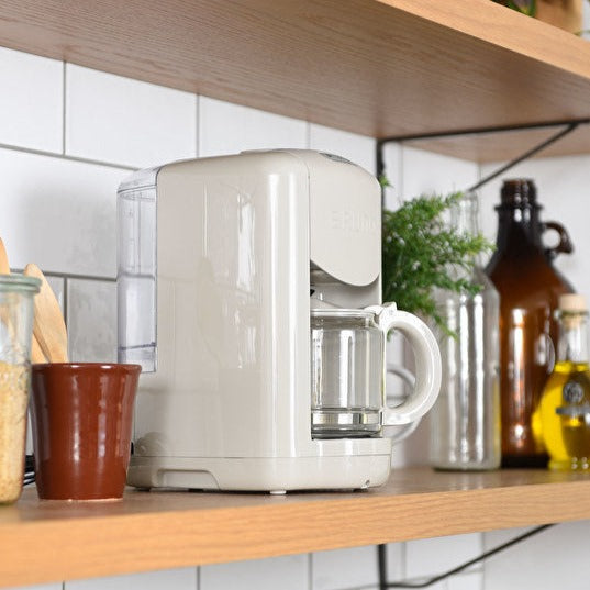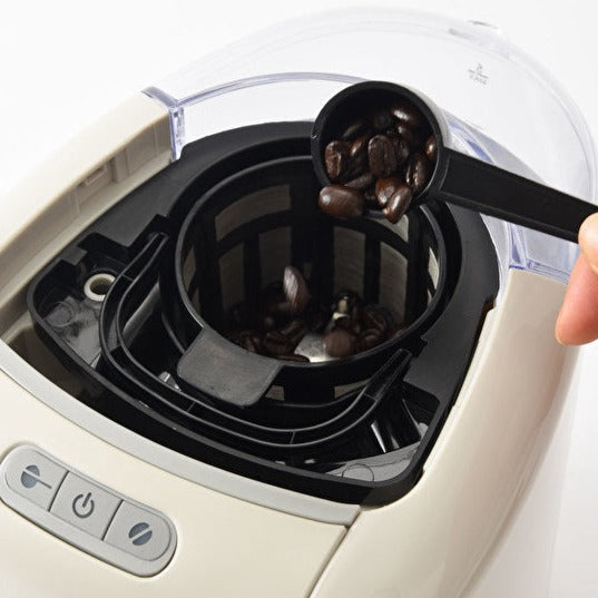 コーヒー豆と水をセットして、スイッチを押すだけで全自動で手軽に挽きたての一杯が愉しめるコーヒーメーカーです。ドリップ時、ペーパーレスで経済的&エコに使えるメッシュフィルターを使用して、2〜5杯分を抽出できます。コンパクトでレトロなデザインは場所を取らず、キッチンやテーブルに置いて毎日の暮らしに寄り添います。