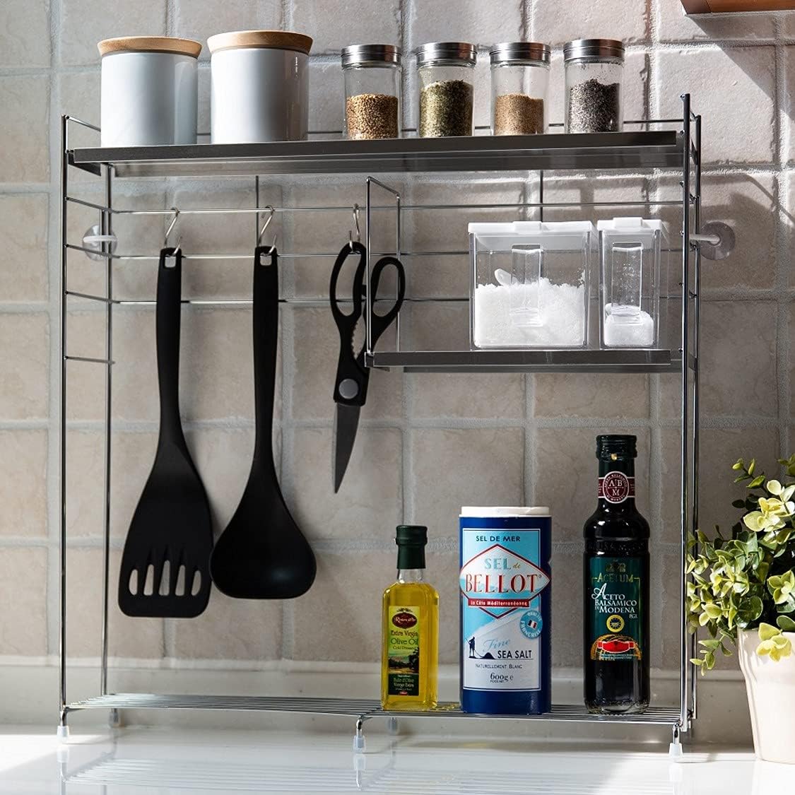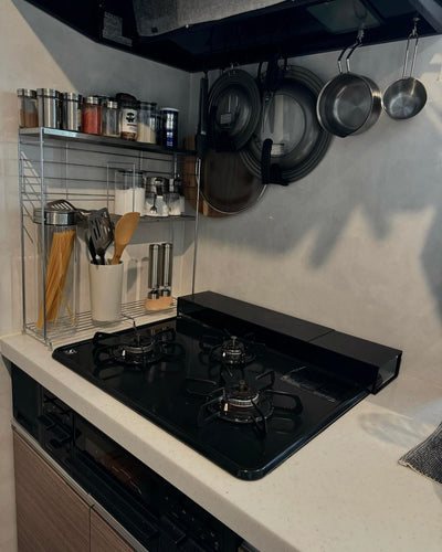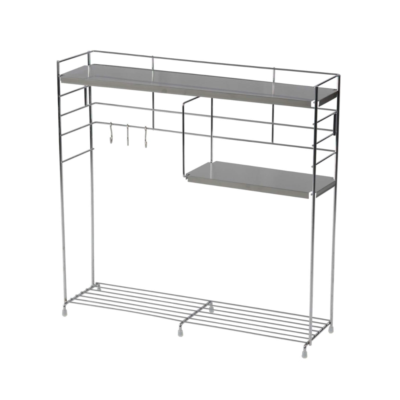 コンロのごちゃつきをすっきり解消するステンレス天板キッチンラックです。奥行14cmでスリムだから、狭いキッチンでも場所をとらずに収納スペースを確保できます。S字フック3本付きだから、キッチンツールの吊り下げ収納に調度いいアイテムです。