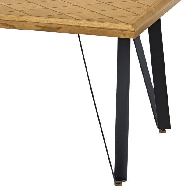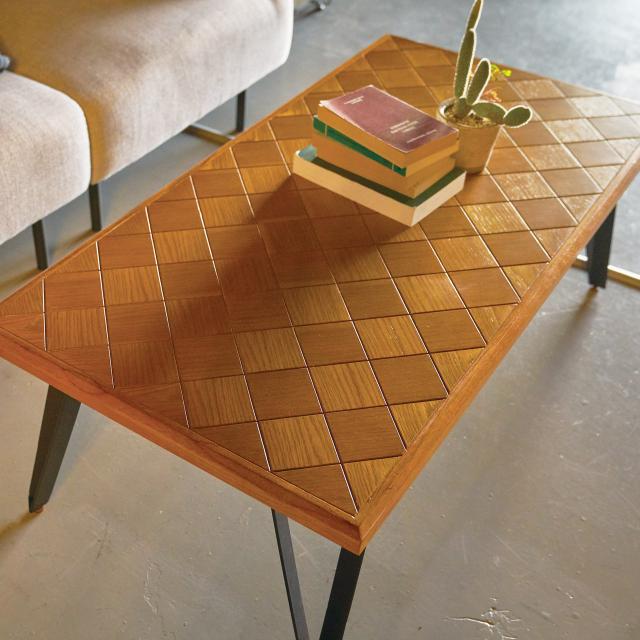 天然木の木板をチェッカーボードに組み合わせた人気のローテーブルです。耐久性と耐水性にも優れているオーク材の天板と、ブラックアイアンでスタイリッシュな脚が特徴です。重厚で硬いので反りが生じにくく傷もつきにくい素材になっています。