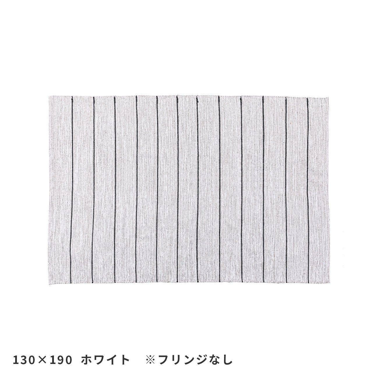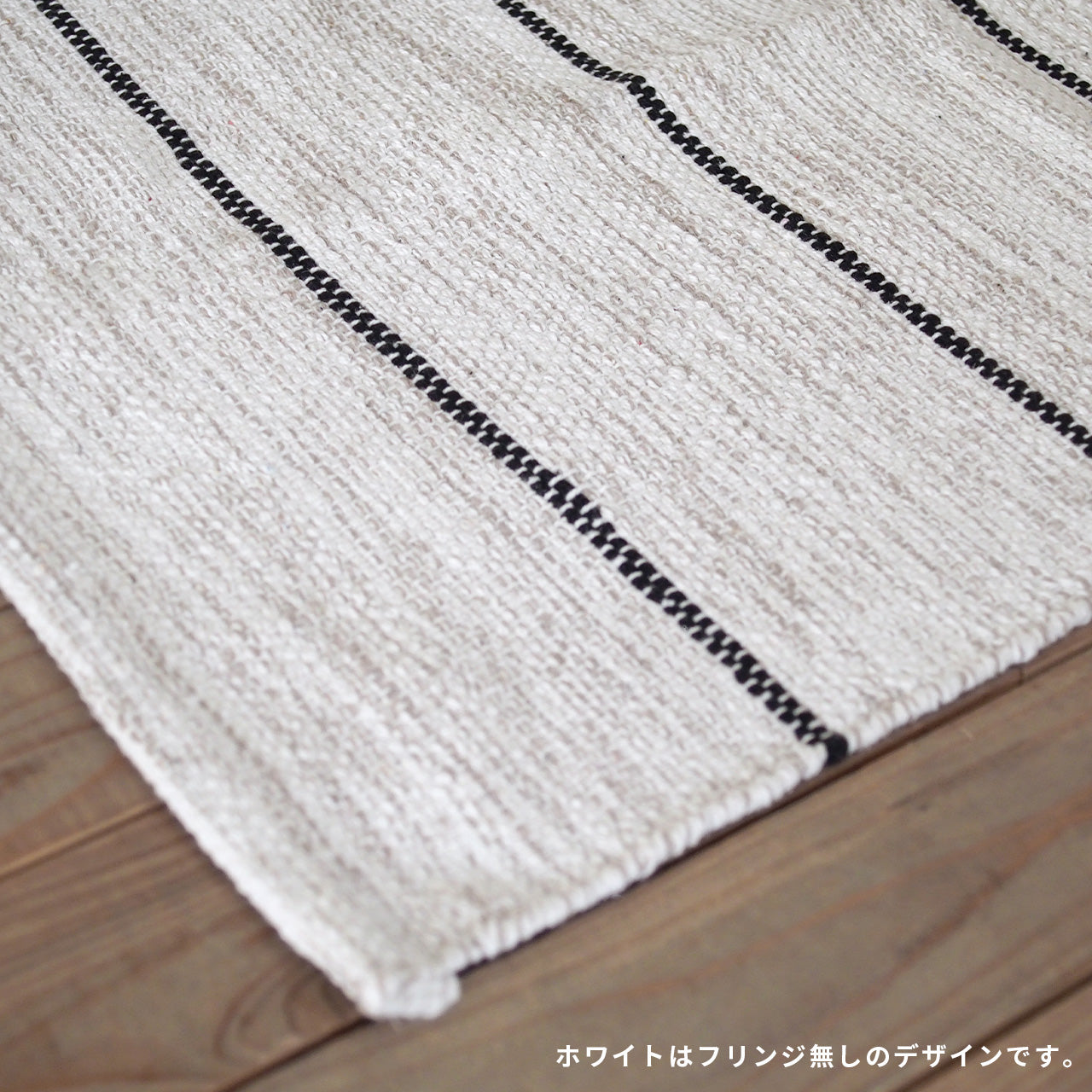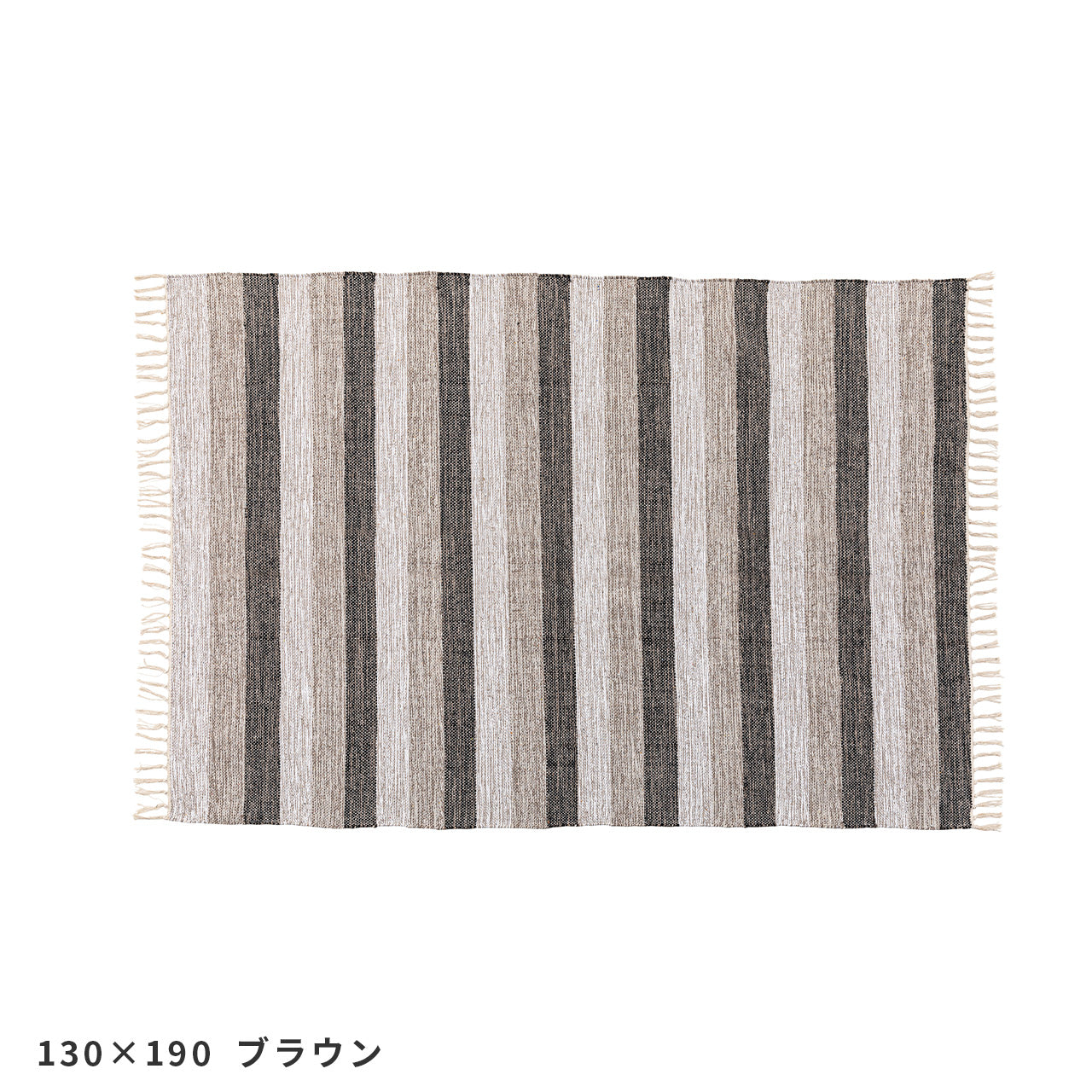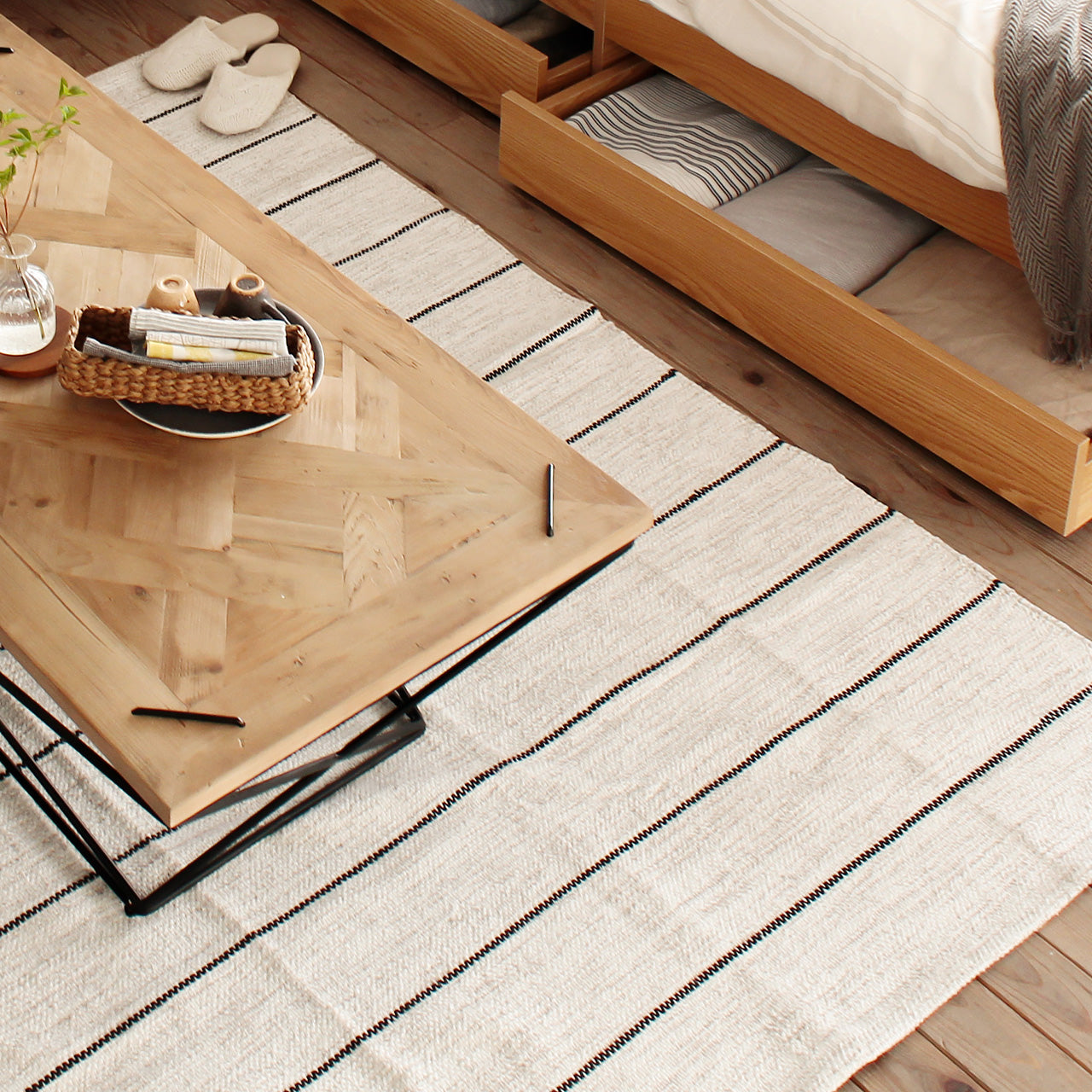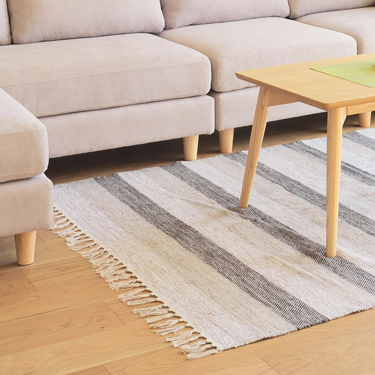 落ち着いたナチュラルカラーがお洒落な、モダンでコーディネートしやすいストライプ柄のインド製のコットンラグです。コットンのさらりとした肌ざわりで、快適に過ごせる素材感です。床暖房やホットカーペットの上からもご使用いただける程よい厚みです。