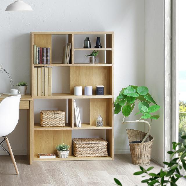 ランダムに配置されたオープン棚と背付棚により、壁付設置だけでなく、お部屋の間仕切り棚としても使用できる見た目と利便性を両立したデザインのシェルフです。A4サイズのファイルも収納可能です。
