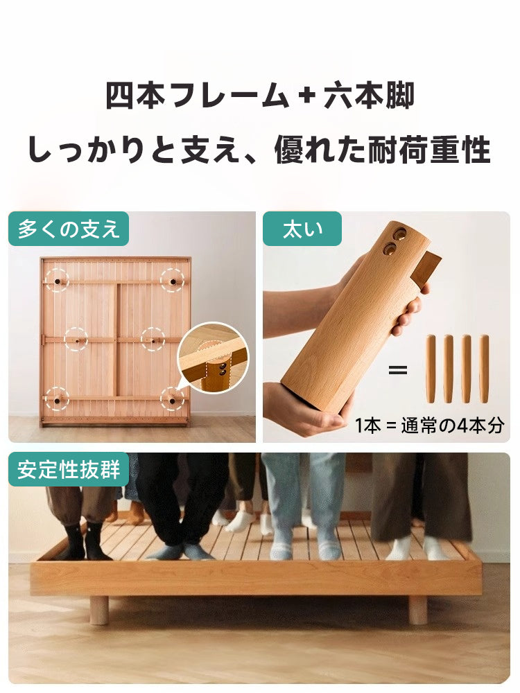 チェリー材フローティングウッドベッドは、最高級のチェリー材を使用し、上品な赤みと経年変化を楽しめる美しさと実用性を兼ね備えたベッドです。北米産FASグレードのチェリー材とドイツ産FASグレードのブナ材を採用し、耐久性と安定性が抜群。4本のフレームと6本の脚部が荷重を均等に分散し、揺れやきしみを抑えます。静音設計で振動や摩擦音を防ぎ、快適な寝心地を提供。省スペース設計で収納スペースも確保。ファミリーやカップルに最適なシンプルでナチュラルなデザインです。