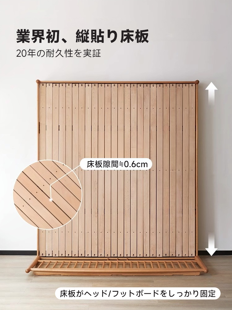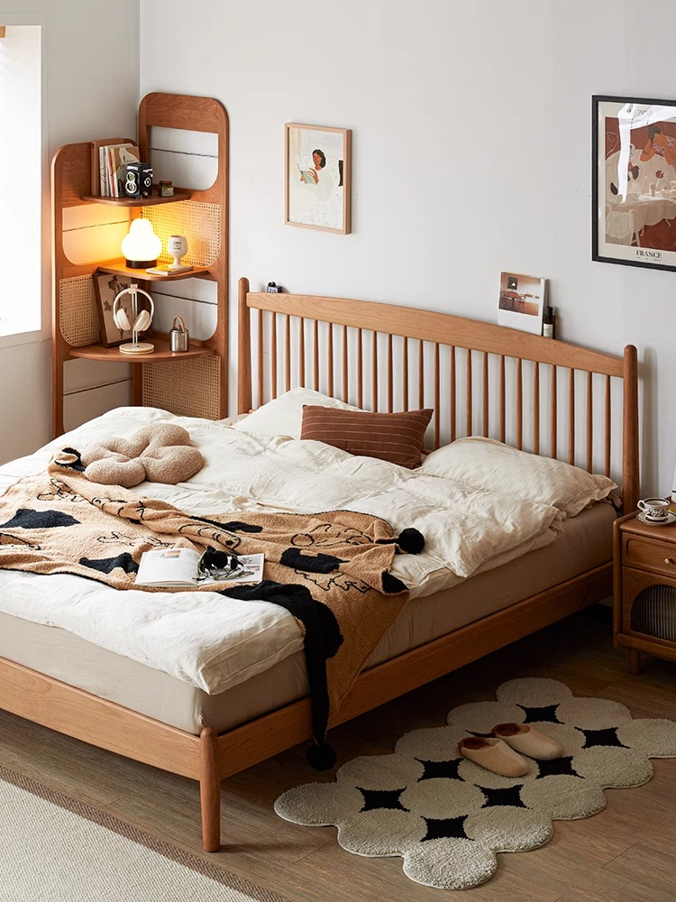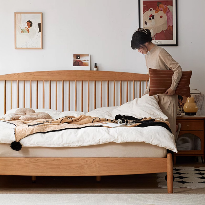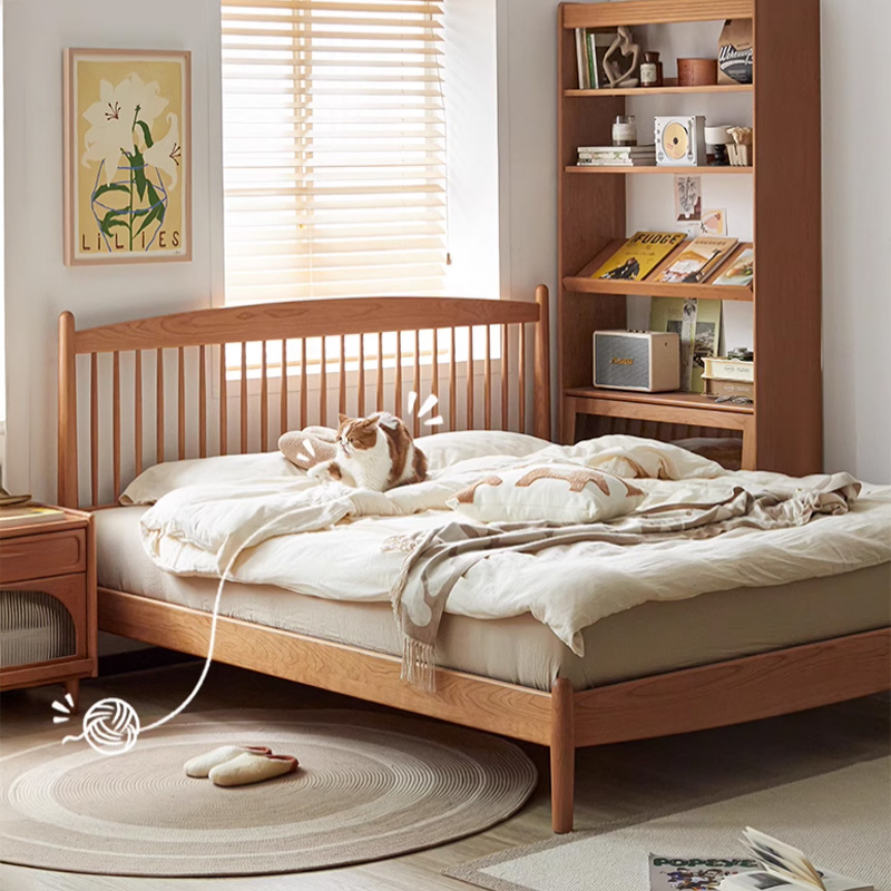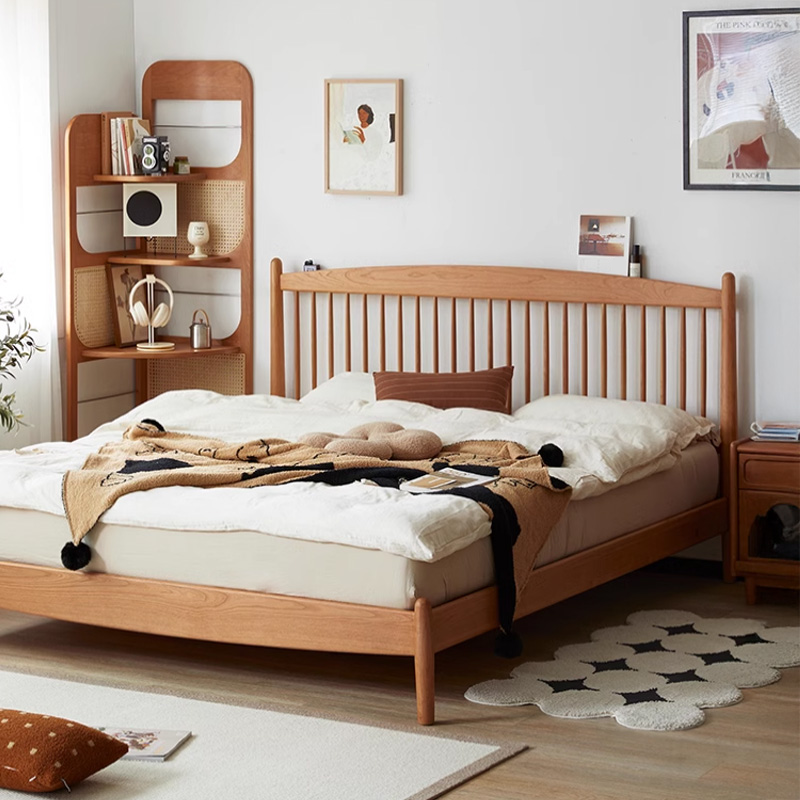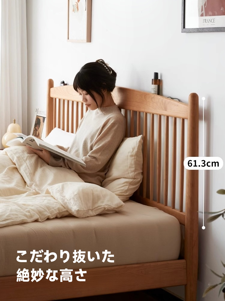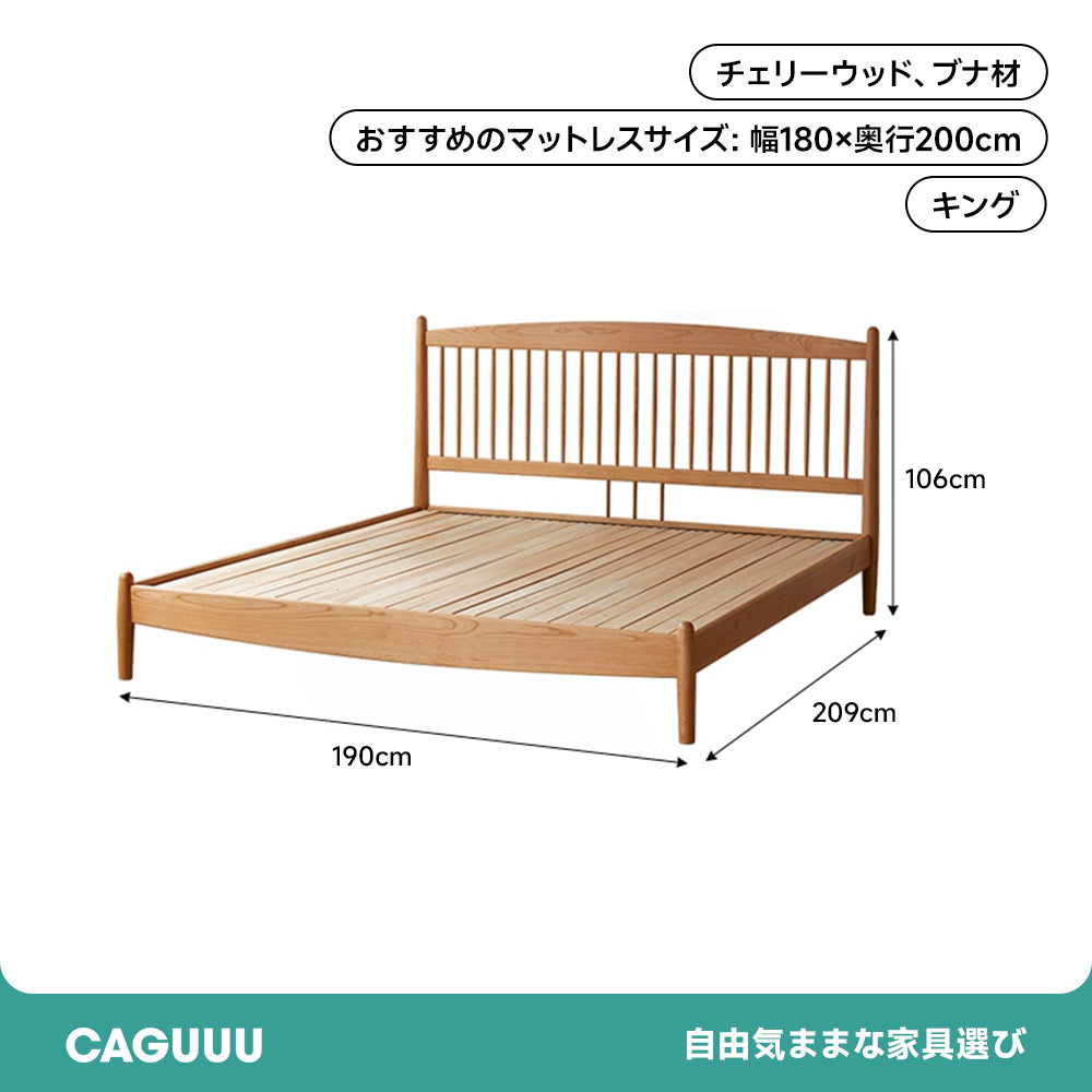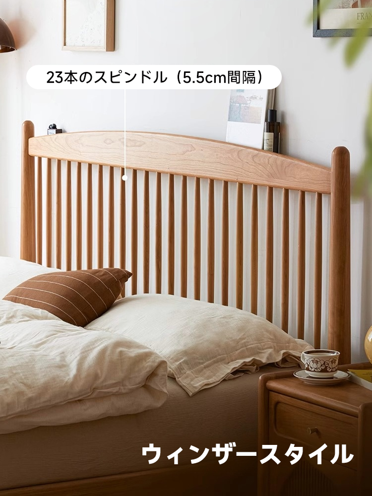 チェリー材 クラシックウィンザースタイルベッドは、北米産FASグレードのチェリー材を使用し、優雅なデザインと高品質な素材で寝室を上品に彩ります。クイーンサイズとキングサイズがあり、23本のスピンドルが背中をしっかりサポート。縦貼り床板と二重シャフトカップリングで耐久性と静音性を実現。組立サービスも提供しており、ファミリーやカップルに最適な選択です。