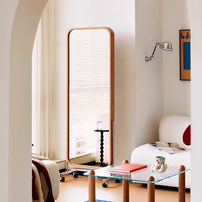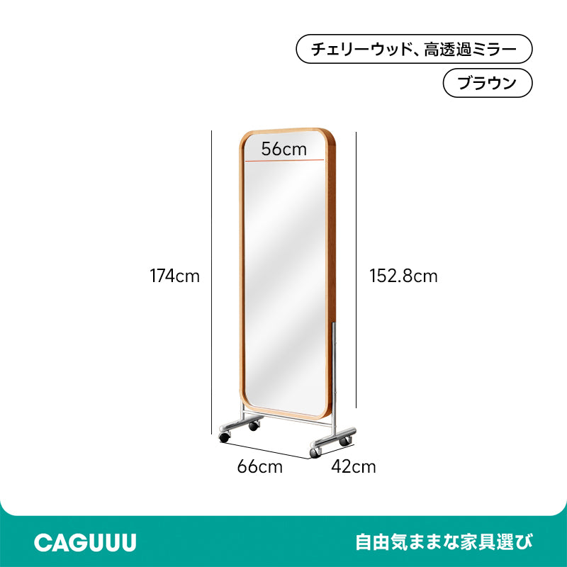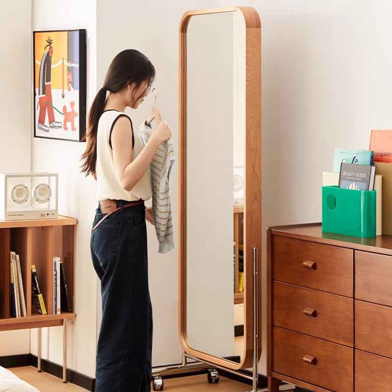 チェリー材 ナチュラルウッドフレームミラーは、北米産FASグレードのチェリー材を使用した高級感あふれるデザインが特徴です。滑らかな質感と繊細な木目が空間に温かみを添え、片面がミラー、もう片面が雑誌ラックの2WAY仕様で収納と実用性を兼ね備えています。高さ174cm、幅56cmの大きめサイズで、180cmを超える方でも全身をカバーできます。360°回転キャスター付きで移動も簡単。環境に優しい銅末使用のミラーとパッシベーション保護膜で、3倍の抗酸化性能を発揮し、長寿命です。ベッドルームやドレッサー、ファミリー向けやカップル向けの空間に最適な組立品です。
