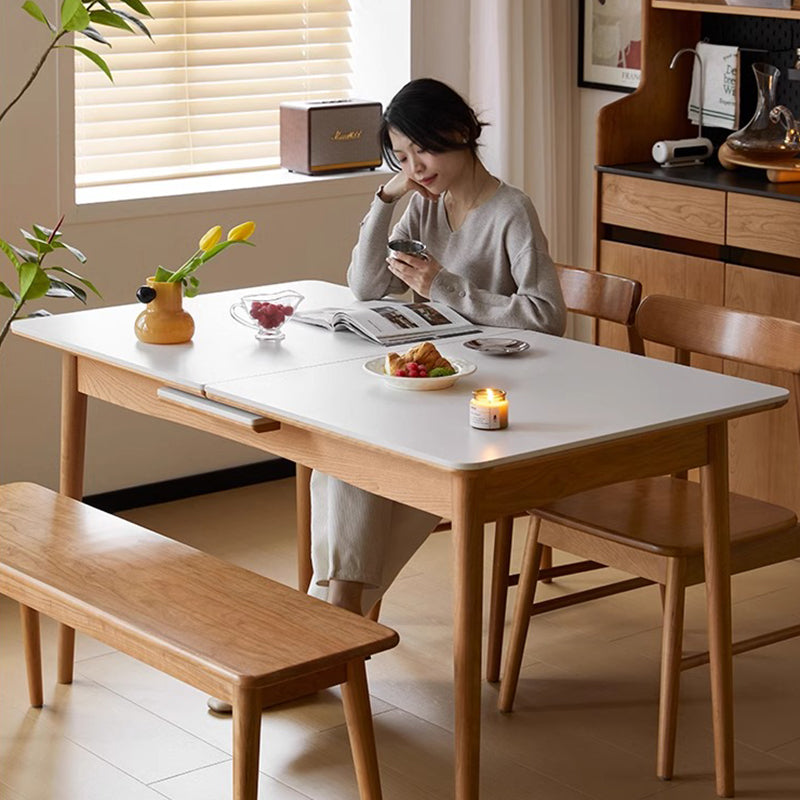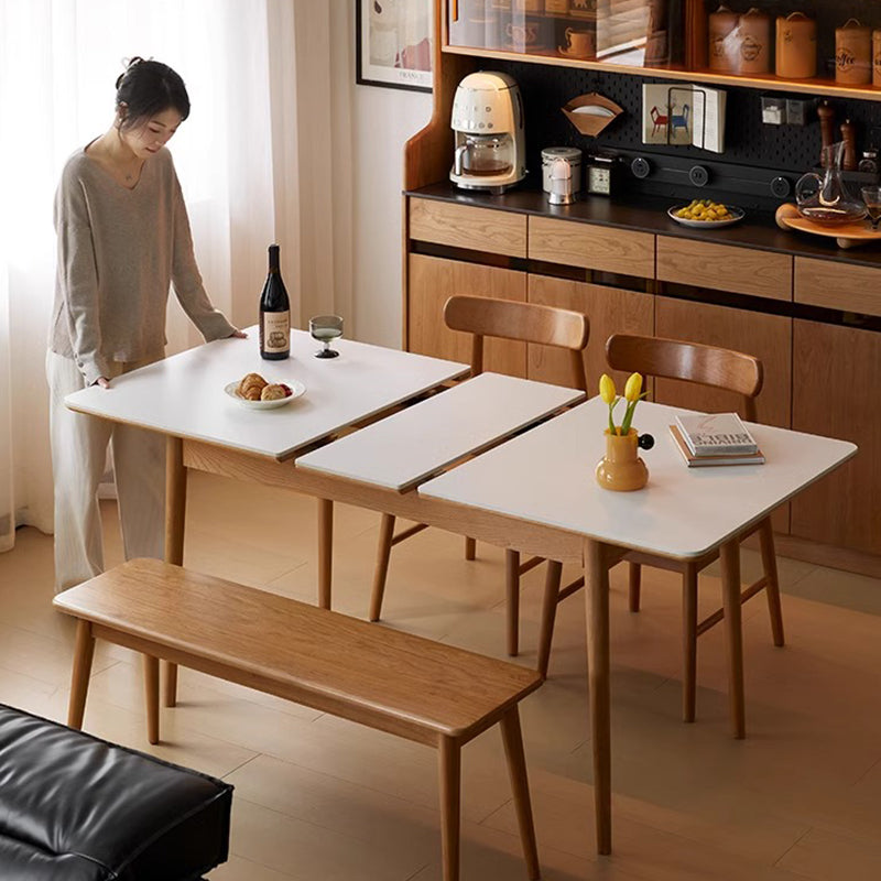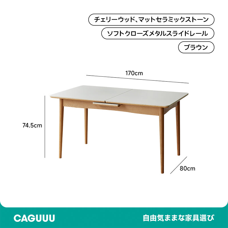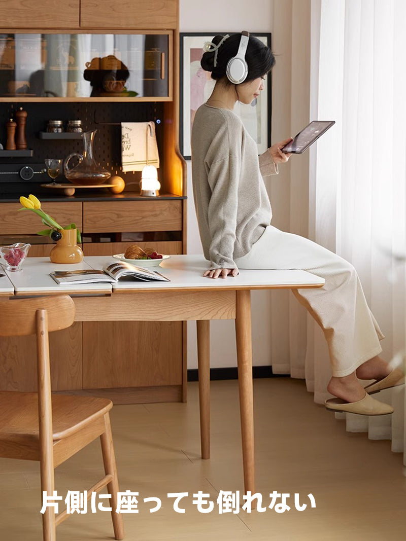 チェリー材の展開拡張ダイニングテーブルは、シンプルでナチュラルなデザインが特徴です。高級感のあるチェリー材を使用し、耐久性と美しさを兼ね備えています。伸長式デザインで、通常時1.4m、展開時には1.7mまで拡張可能。北米産FASグレードのチェリー材と1.2cmのマットセラミックトップを使用し、高温や傷に強く、耐久性に優れています。ソフトクローズメタルスライドレールで静かに開閉可能。汚れが付きにくく、簡単に清掃できるセラミックトップ。丸みを帯びたデザインで安全性も高く、どんなインテリアにもマッチします。