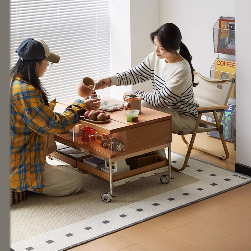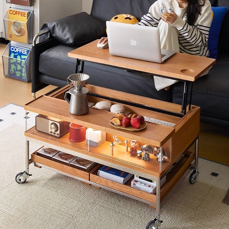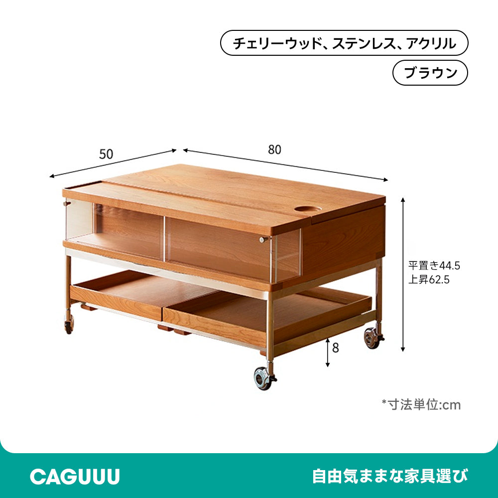 チェリー材のマルチファンクションリビングテーブルは、北米産FASグレードチェリー材を使用し、耐久性と美しい木目を実現。シンプルながらも多機能なデザインで、昇降可能な天板やスライド式の収納スペース、キャスター付きで移動も簡単。ファミリーやカップルの生活空間にぴったりのリビングテーブルです。ナチュラルな風合いと高級感を兼ね備え、安全性を考慮した角丸加工が施されています。