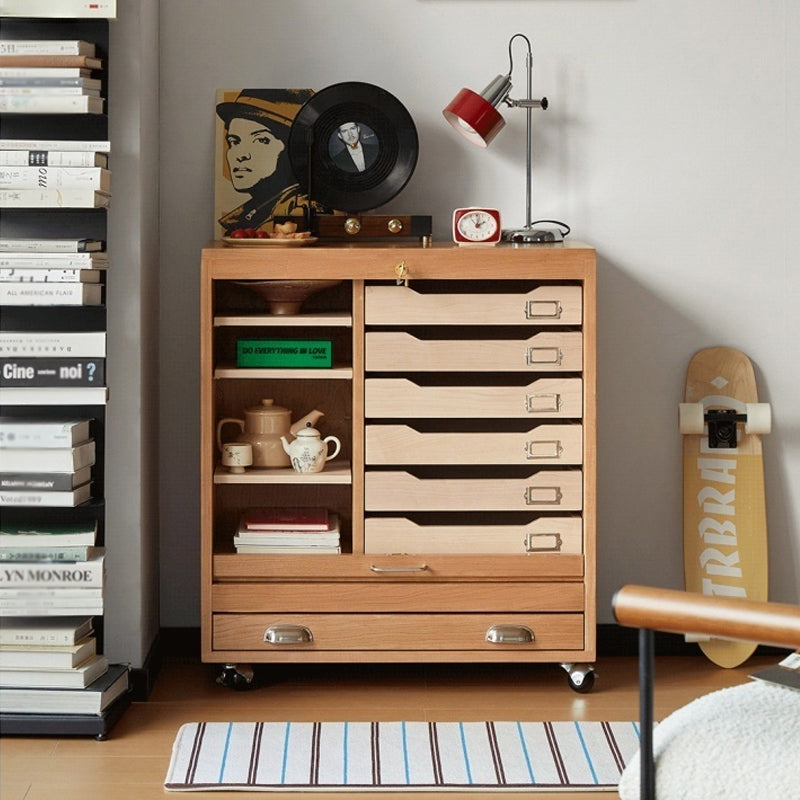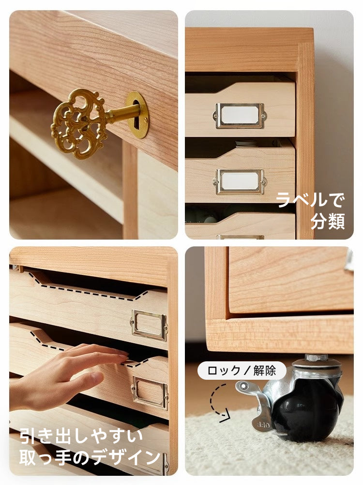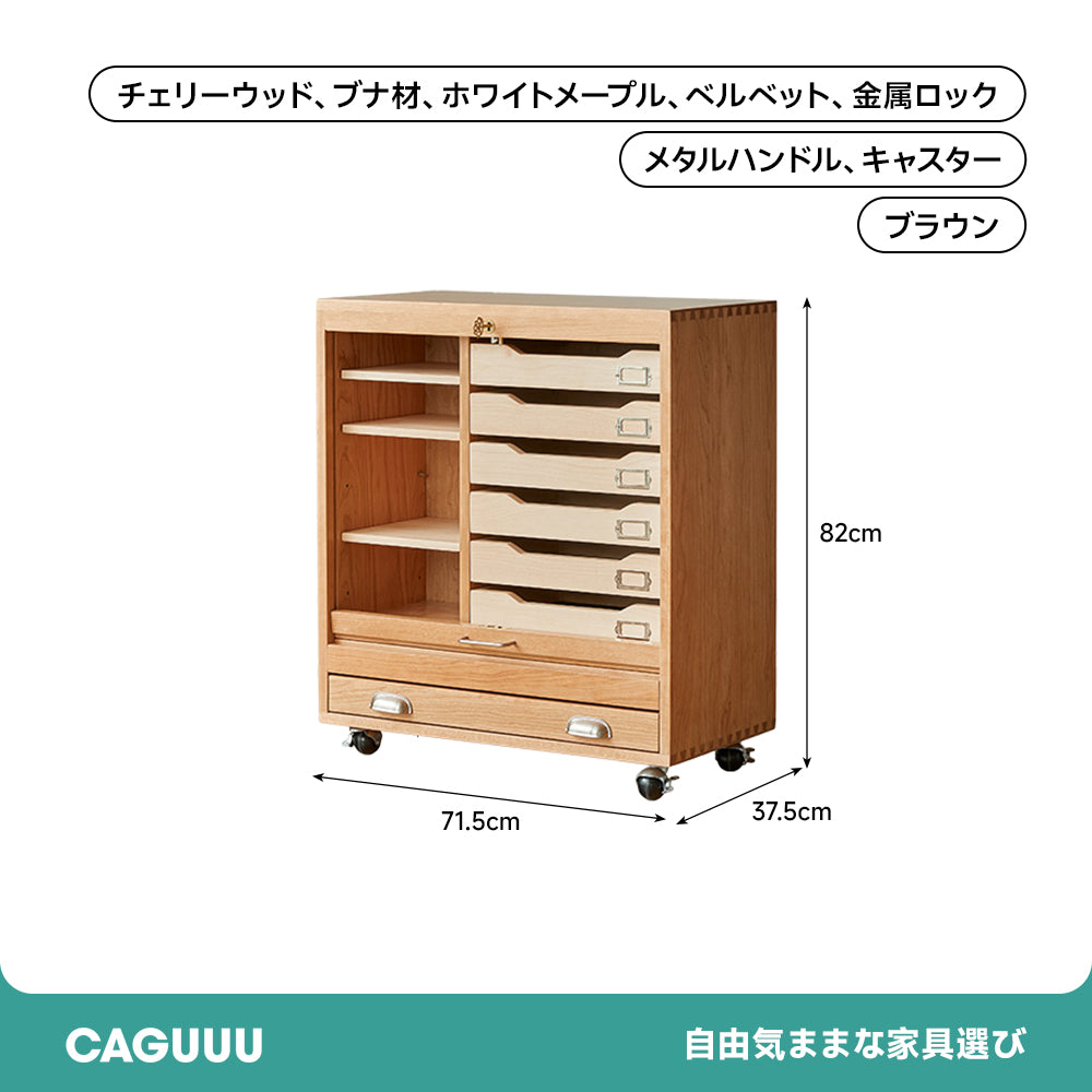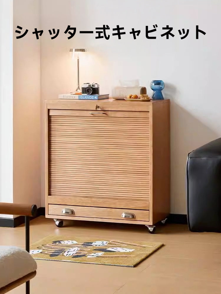 チェリー材シャッター式キャビネットは、北米産のFASグレードチェリー材を使用した高級感あふれる収納家具です。ナチュラルなブラウンの色合いがリビングや書斎にぴったりで、ファミリーやカップルに最適です。シャッター式の扉で埃を防ぎつつプライバシーを守り、6段の引き出しで書類や小物をすっきりと分類収納可能です。キャスター付きで移動も簡単、コンパクトサイズでどんなインテリアにも調和します。