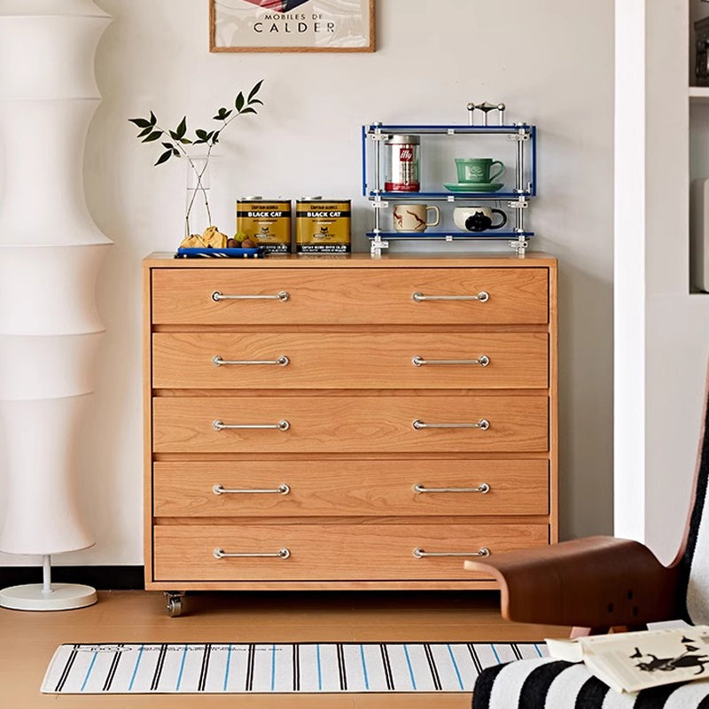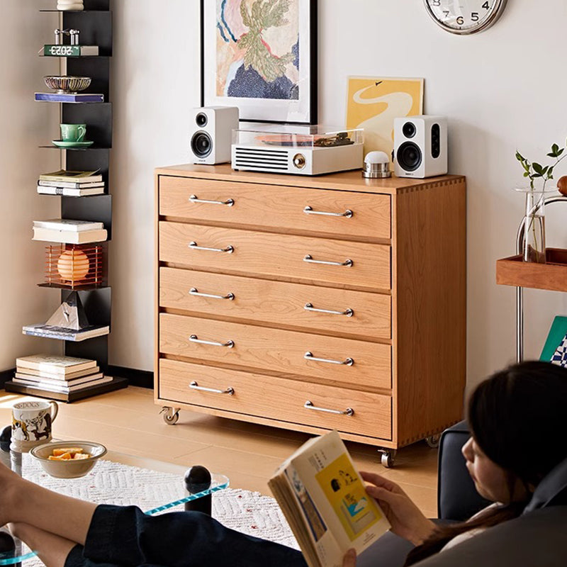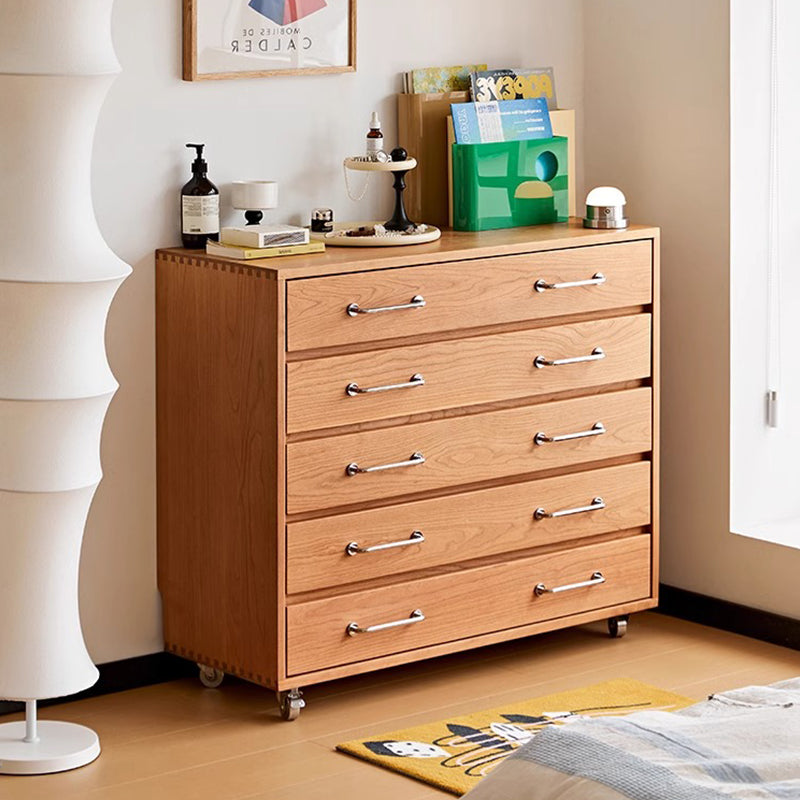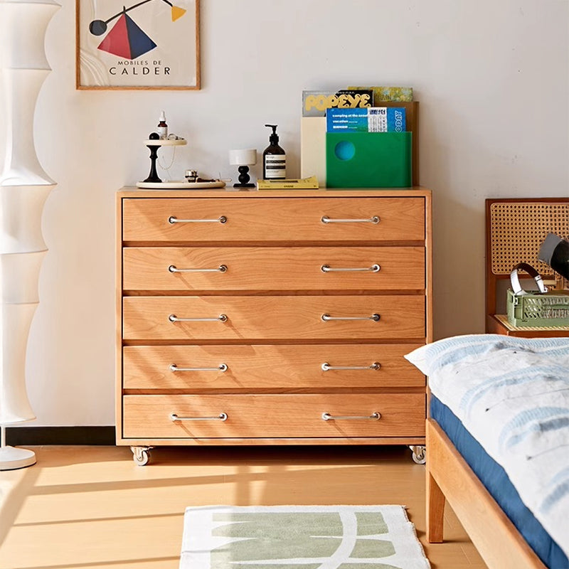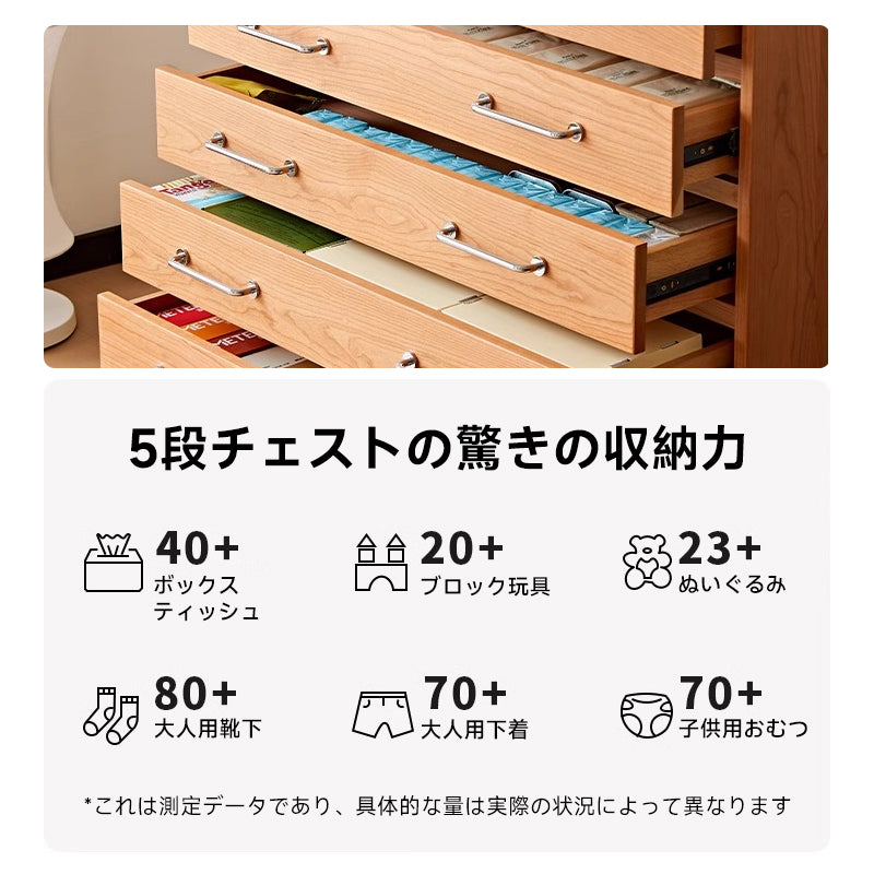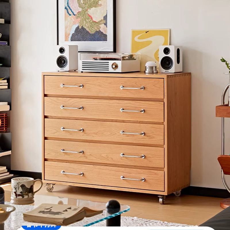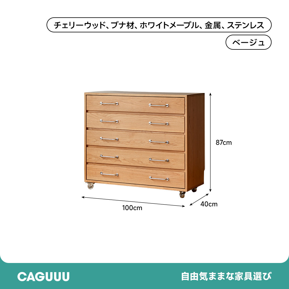 チェリー材キャスター付き5段チェストは、北米輸入のFASグレードのチェリーウッドを使用した高級感あふれる収納家具です。シンプルでナチュラルなデザインが特徴で、どんなインテリアにも調和します。幅100cm、奥行40cm、高さ87cmの大容量収納を誇り、引き出しはスムーズに開閉できる金属レールを採用。304ステンレス製のキャスター付きで移動も簡単。転倒防止装置付きで安全性も確保。組立品で長くお使いいただけます。ベッドルームや寝室に最適なファミリーやカップル向けのデザインです。