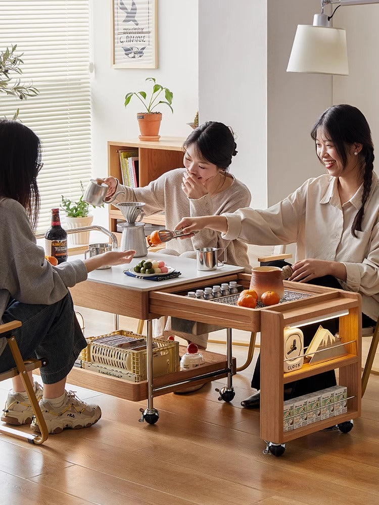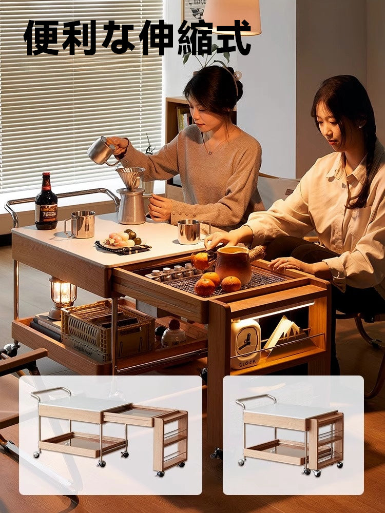 チェリー材 伸縮式リビングキャンプテーブルは、北米産FASグレードのチェリー材を使用し、時間とともに深まる色合いが魅力です。伸縮式デザインでスペースを有効活用し、耐熱性に優れた多機能セラミック天板はお手入れが簡単。収納力抜群で、キャスター付きで移動も楽々。ナチュラルな風合いがリビングを温かみのある空間に変えます。家族やカップルでの使用に最適なこのテーブルは、アウトドアの楽しさを自宅で再現できる理想の一台です。