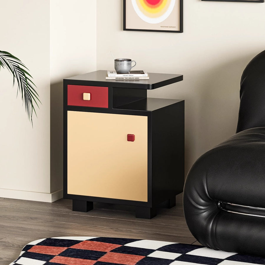 パズル調ベッドサイドテーブルは、ユニークなパズルデザインが特徴で、赤と黒のコントラストがモダンでスタイリッシュな印象を与えます。環境保護E0級の天然木積層合板と天然木ラバーウッド材を使用し、高品質な仕上げが施されています。幅43cm、奥行38cm、高さ58cmのコンパクトなサイズでありながら、収納力に優れ、小さな引き出しと大きな収納スペースを提供します。寝室やリビングルームに最適で、インテリアに個性を加えたい方におすすめです。