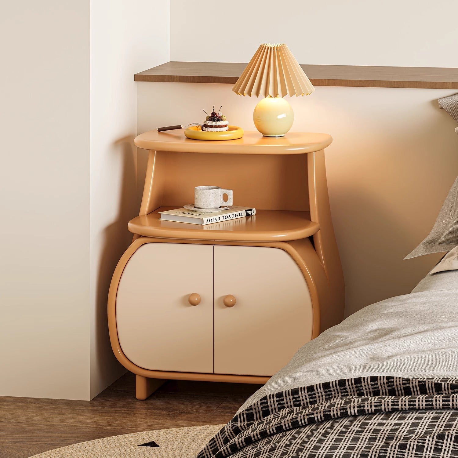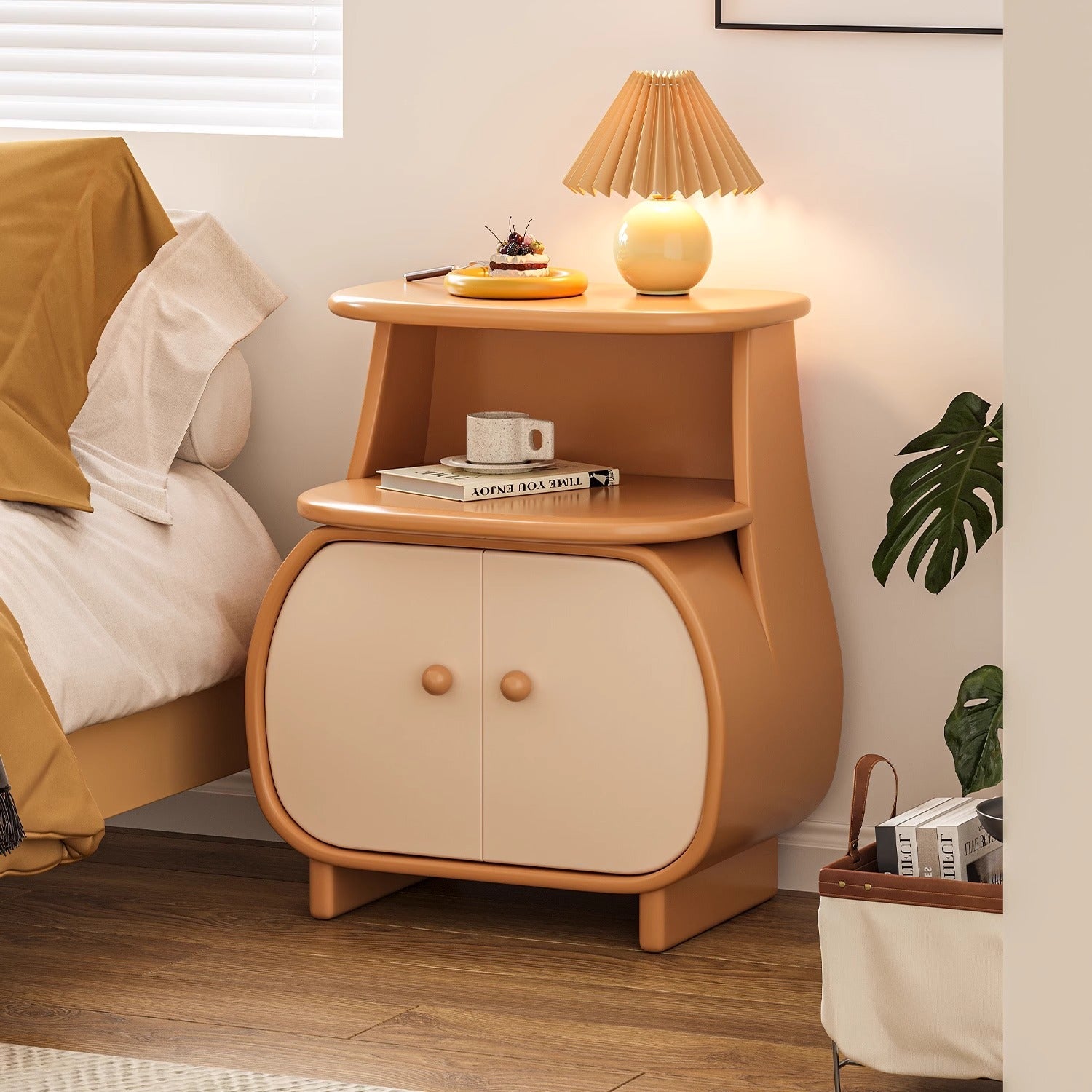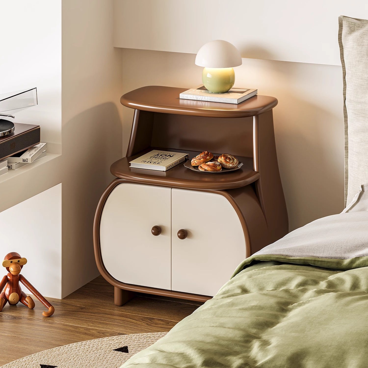 ツートーンナイトキャビネットは、機能性とデザイン性を兼ね備えたおしゃれな家具です。丸みを帯びた優雅なラインと差し色デザインが特徴で、空間に温かみと可愛らしさをプラスします。環境に優しいE0規格の木製合板とE1規格の中密度繊維板を使用し、幅55cm、奥行き34cm、高さ66cmのコンパクトサイズでありながら収納力抜群です。ホワイトとグリーンの2色展開で、どんな部屋にも穏やかな温もりを与えます。