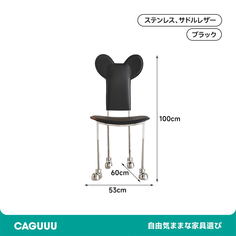耳付きデザインチェアは、遊び心溢れるユニークなデザインが特徴です。背もたれに可愛らしい耳のデザインが施され、シンプルながらも個性的な空間を演出します。高級感のあるサドルレザーとステンレス製フレームを使用し、耐久性と美しさを兼ね備えています。座面は体の曲線に沿うように設計され、快適な座り心地を提供します。リビングやオフィス、子供部屋など、どんな空間にも楽しい雰囲気を加えることができます。