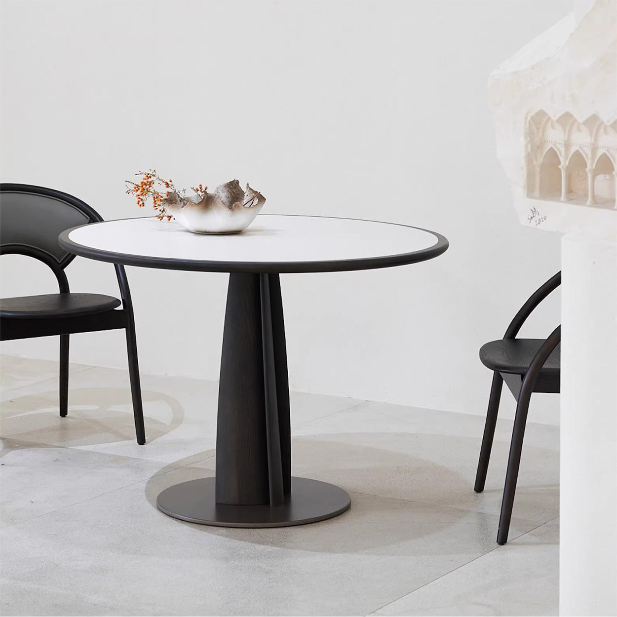 セラミック天板ラウンドダイニングテーブルは、洗練されたデザインと機能性を兼ね備えた一品です。6mm厚のセラミック天板は自然な美しさと耐久性を持ち、汚れが付きにくく、傷や摩耗にも強い特性を持っています。花びらをモチーフにしたエレガントなデザインは、どんなインテリアにも調和し、ホワイトアッシュとセラミックを使用した高品質な素材で作られています。直径90cmと110cmの2サイズ展開で、どんなシーンにも最適です。一本脚のデザインにより足元が広々と使え、12mm厚の鋳鉄製の土台で安定感も抜群です。組み立て式で簡単に設置可能、食事や仕事、一人の時間を快適に演出します。