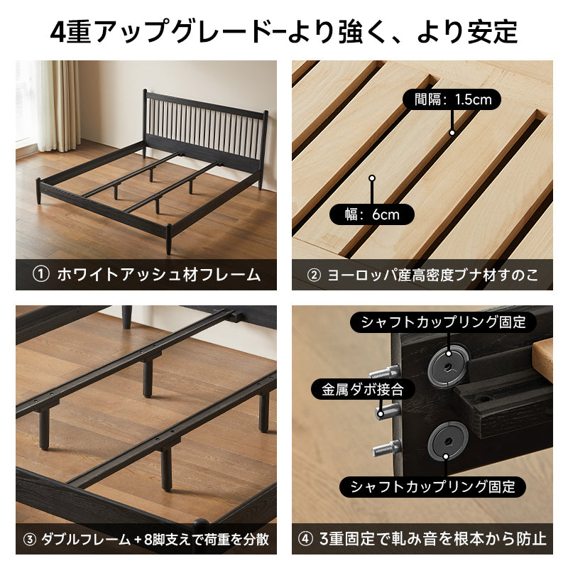 ホワイトアッシュ材ハイバックベッドは、北米産FASグレードのホワイトアッシュ材を使用し、耐久性と美しさを兼ね備えた高級感あふれるデザインが特徴です。シンプルでエレガントなジャパンディスタイルは、どんな寝室にも調和し、ファミリーやカップルに最適です。クイーンサイズとキングサイズから選べ、23本の縦格子が背中にフィットし、圧迫感なくリラックスできる設計です。ヘッドボードには便利な収納スペースがあり、ロボット掃除機も楽に通れる床下スペースを確保しています。組立が簡単で、しっかりとした構造を実現するこのベッドは、快適な睡眠環境を提供します。