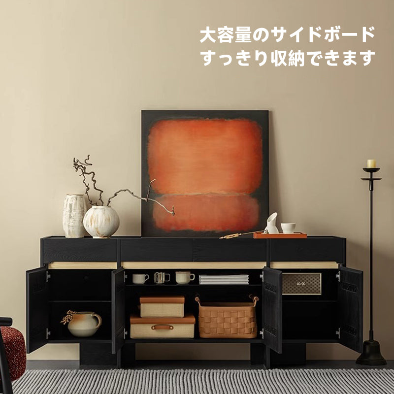 ホワイトアッシュ材 木製サイドボードは、北米産FASグレードの炭化ホワイトアッシュ材を使用した高級感あふれる収納家具です。シンプルでエレガントなデザインは、リビングルームにぴったりで、ファミリーやカップル向けのスタイリッシュなインテリアに最適です。大容量の収納スペースと調整可能な棚、取っ手レスのモダンなデザインが特徴です。組立が必要ですが、ステンレス製ヒンジと金属製スライドレールによりスムーズな開閉を実現。ジャパンディスタイルを取り入れた機能性とデザイン性を兼ね備えた逸品です。