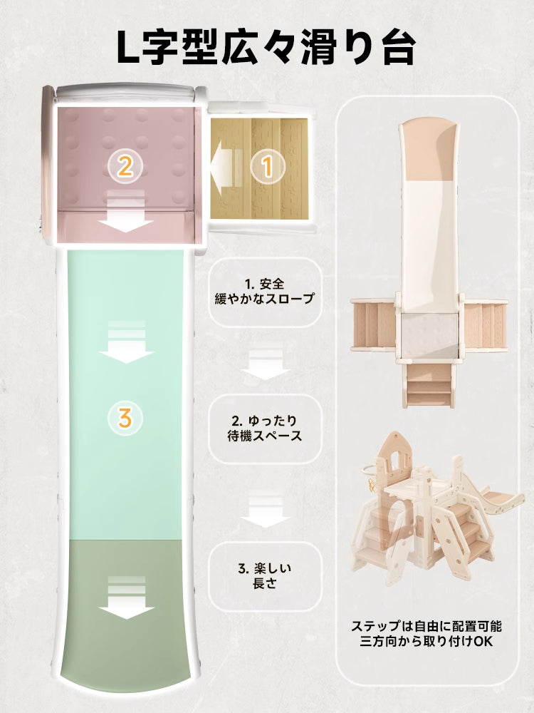 L字型滑り台&ブランコセットは、子供の遊び心を刺激する多機能な遊具です。家庭や商業施設、遊園地、学校など様々なシーンで使用可能で、安全設計や環境に優しい素材を使用しています。耐荷重80kgでしっかりとした安定感があり、折りたたみ式バスケットゴールが付属しています。全体のサイズは182cm x 149cm x 103cmでコンパクトに設置可能。子供たちの成長をサポートする信頼の品質で、家族全員が安心して楽しめる商品です。