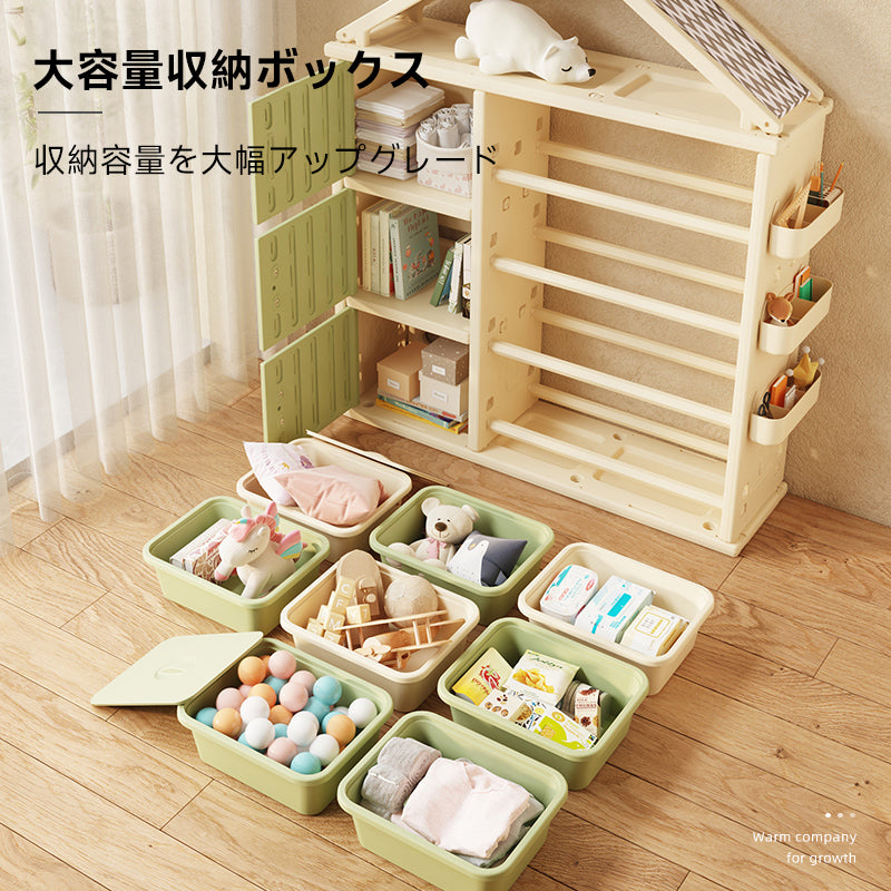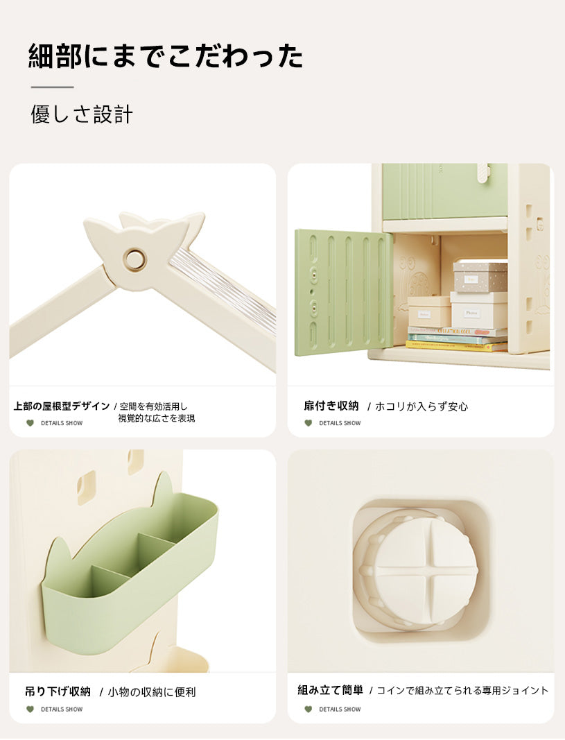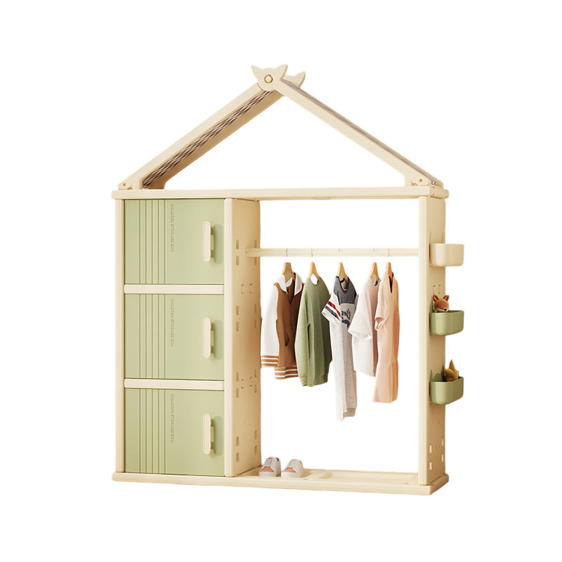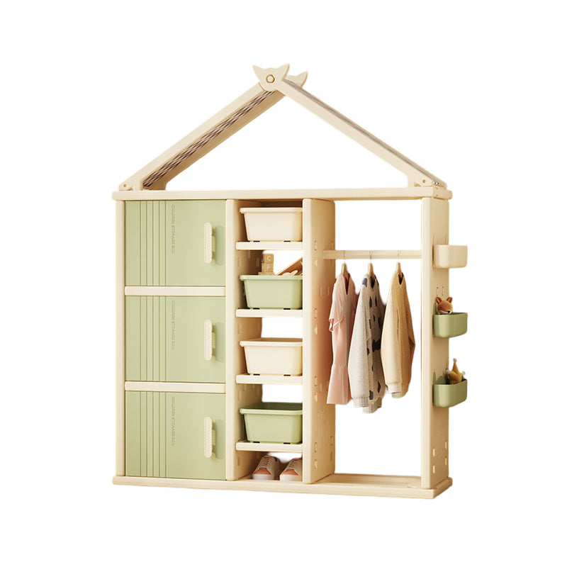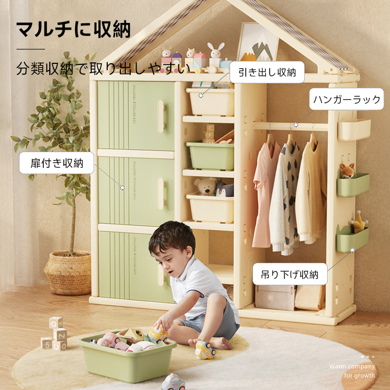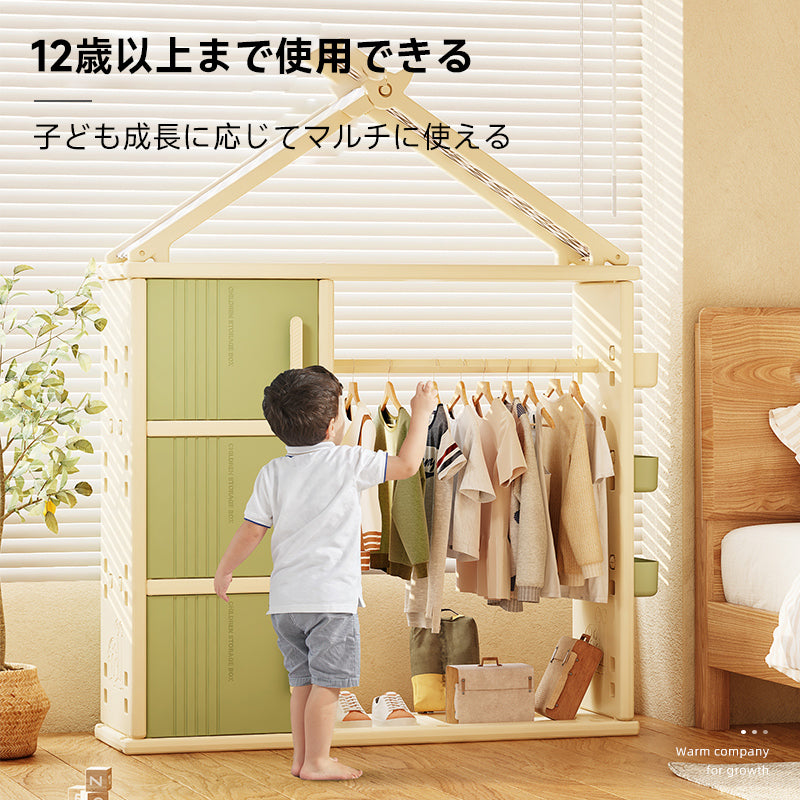 屋根付きデザイン収納ラックは、子どもの成長に合わせて長期間使用できる多機能な収納ソリューションです。衣類、おもちゃ、本などを分類して収納できるため、一目でどこに何があるかが分かります。環境に優しいHDPE素材を使用し、安全性と耐久性に優れています。組み立ても簡単で、0歳から12歳以上まで使用可能。アイボリーとグリーンの2色展開で、お部屋のインテリアに合わせやすいデザインです。