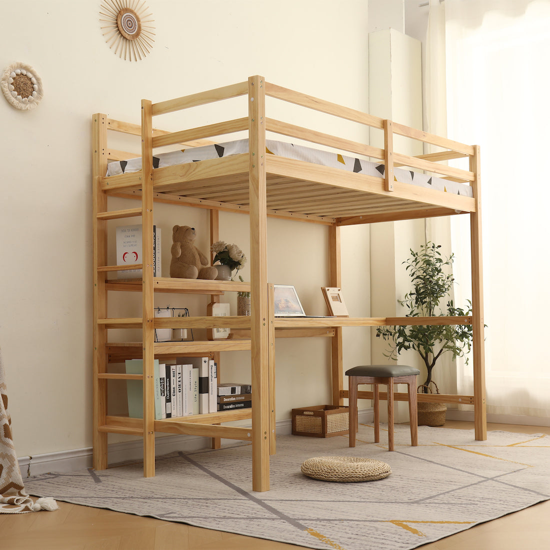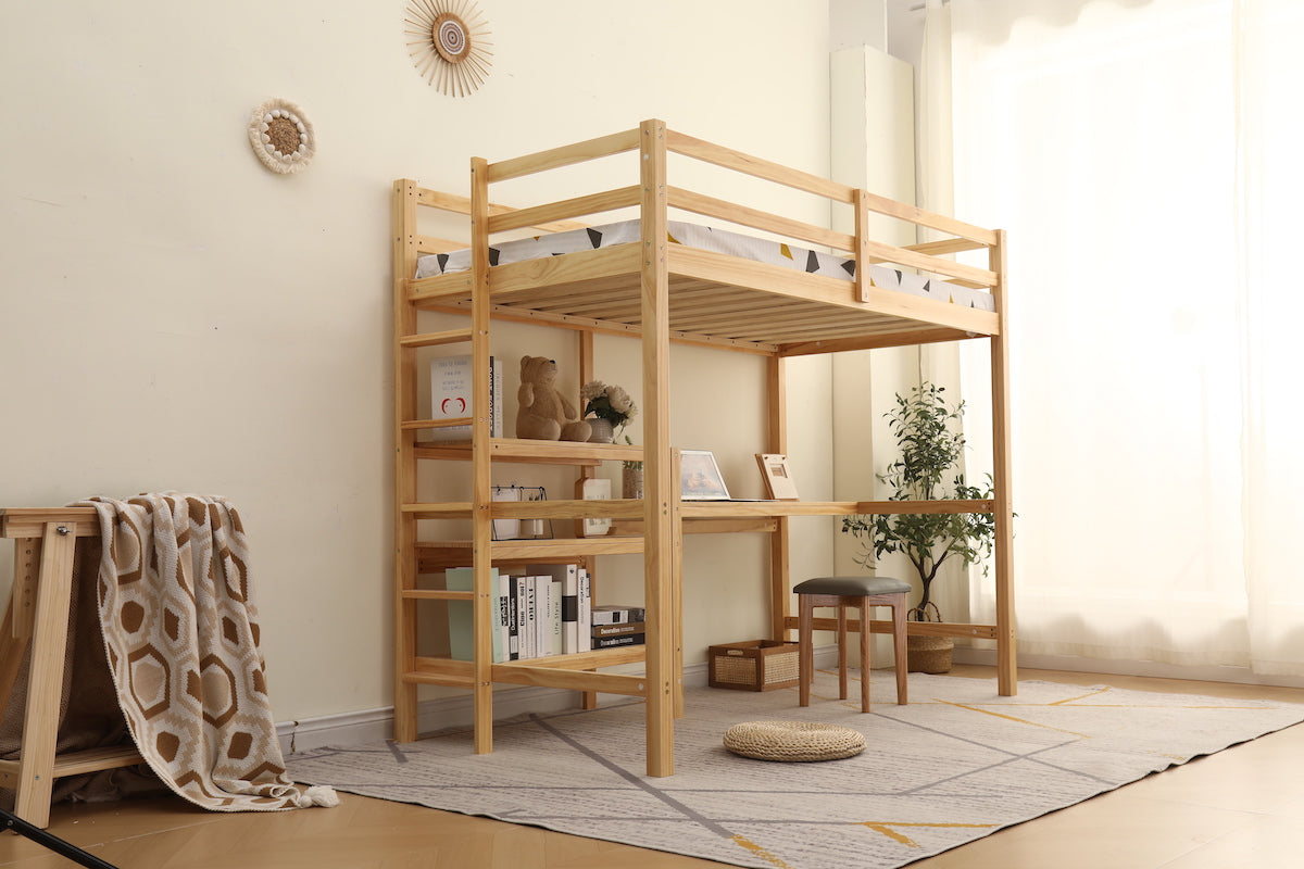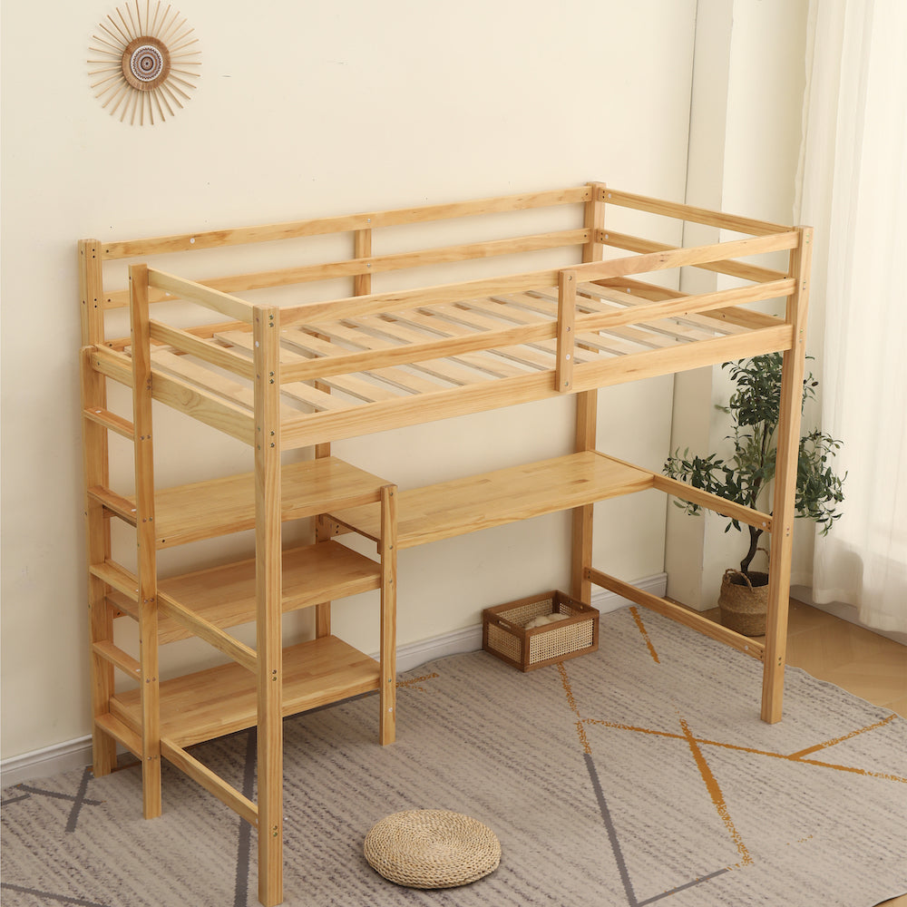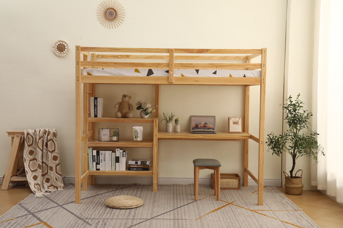 木製デスク付きロフトベッドは、限られたスペースを最大限に活用するための理想的なソリューションです。学生や一人暮らしの方に最適で、成長期の子供にもぴったりです。多機能デザインでベッドとデスクが一体化し、ナチュラルとホワイトの2色展開でどんなインテリアにも調和します。ニュージーランドパインを使用した耐久性のある構造で、150kgまでの耐荷重を実現。安全性も考慮され、高いベッドガードと通気性に優れた床板構造で安心してご利用いただけます。デスク下の広々とした収納スペースで整理整頓も簡単。131.5cmの高さがあり、プライベート空間を確保できます。